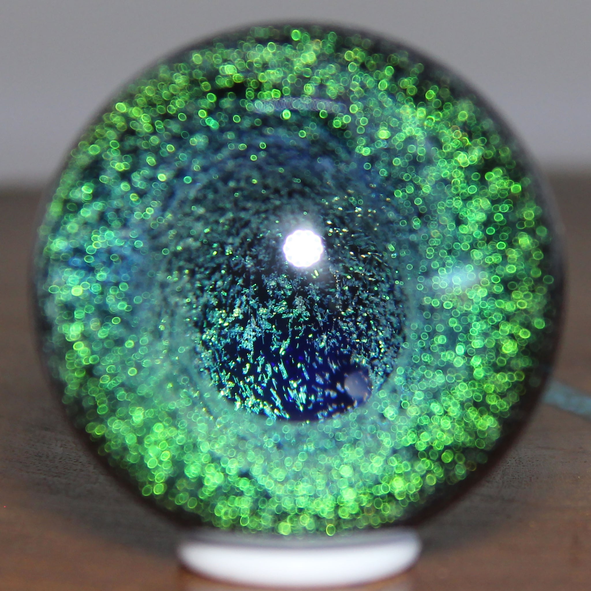 Glass Artisan Kevin O'Grady is the man who breathed life into this. He is the man who developed, mastered and perfected the techniques for these creations, and his skill is ‘light’ years beyond his nearest competitors. He is the only craftsman who employs 'Vortex Dichroism'. What does that colossal name mean? Vortex is the effect in these orbs. When gazing into the glass, a vortex extends into the back, far into the back, farther than the dimension of the marble. The illusion makes the vortex appear to extend over 2 times farther than the marble actually is deep.