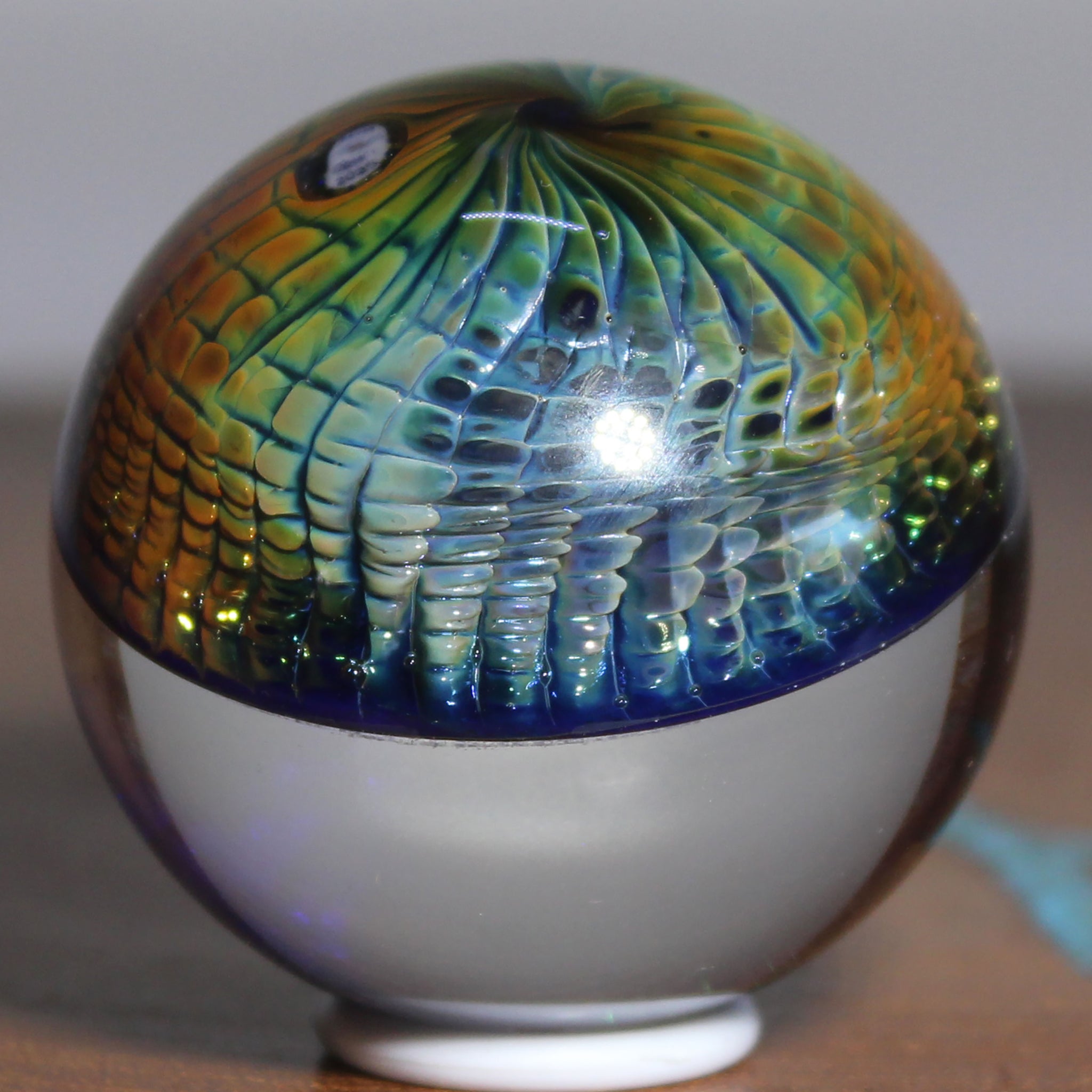 This remarkable orb showcases brilliant shades such as electric green and blue. This borosilicate is the ultimate material for creating the clearest, most brilliant, liquid-like transitional orb possible. This borosilicate is the ultimate material for creating the clearest, most brilliant, liquid-like transparent orb possible. The underside is a kaleidoscope of millefiore ensemble pieces creating unique one-of-a-kind orbs.