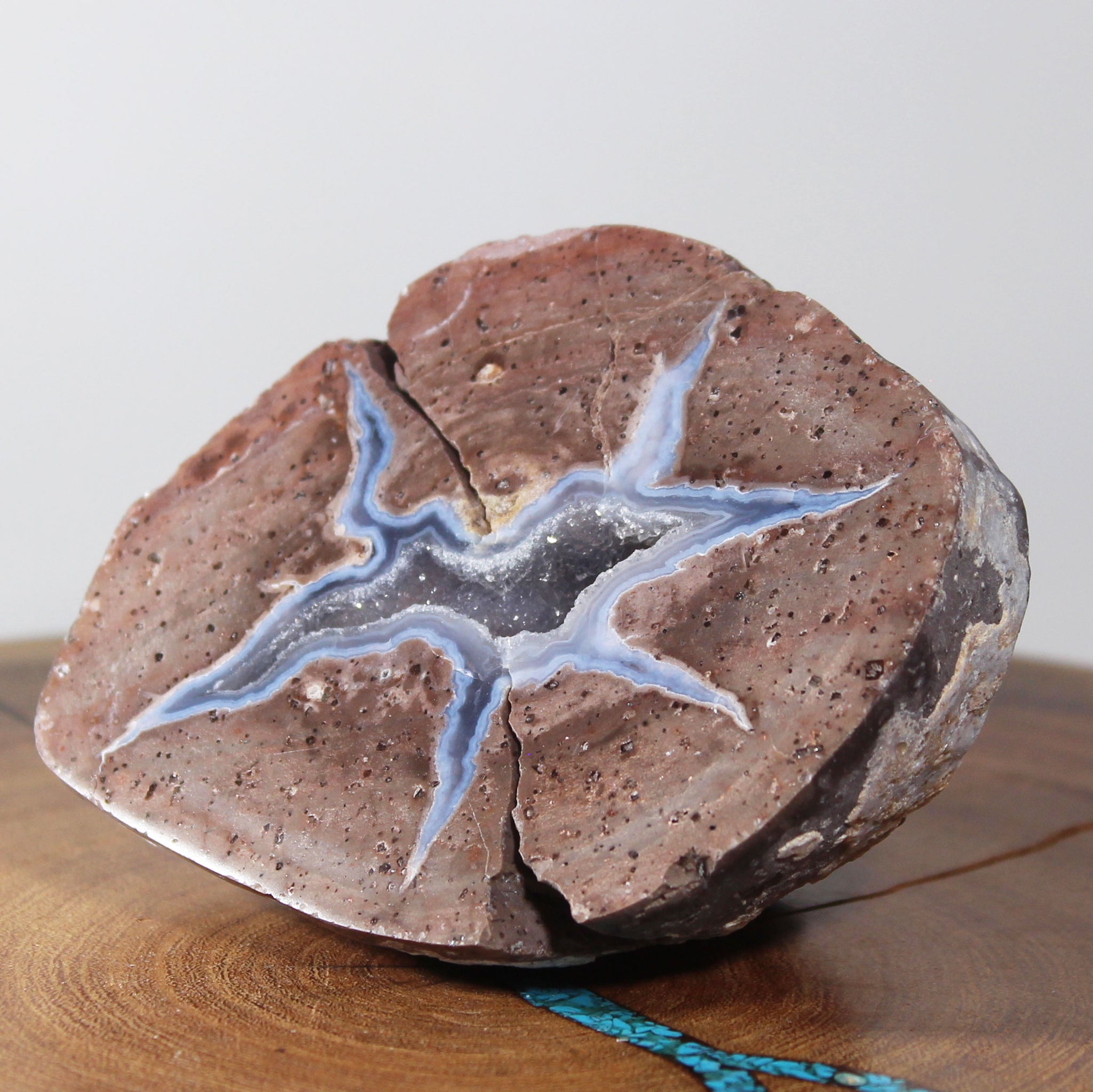 This is a special Dugway geode. The inner area features a starburst shape, open chamber with microscopic crystals lining the inside. This starburst is created from the purest soft blue mineral. Then there is the outer petrified ancient brown mud. The inner blue and outer brown contrast perfectly with each other. Also referred to as a 'Thunder Egg', this geode, as with all my Dugways, is from the finest beds of geodes in Utah, known as the Juab Formation. I buy these directly from the miners who excavate them. An acrylic stand is included for displaying this crystal.