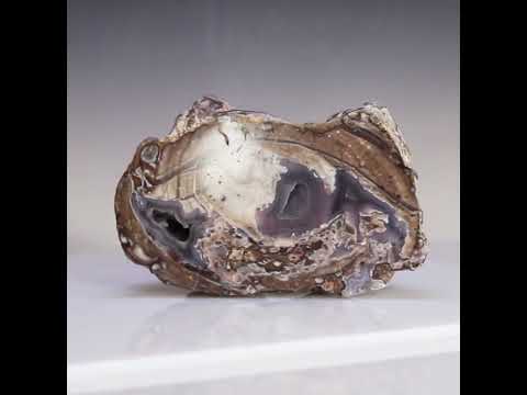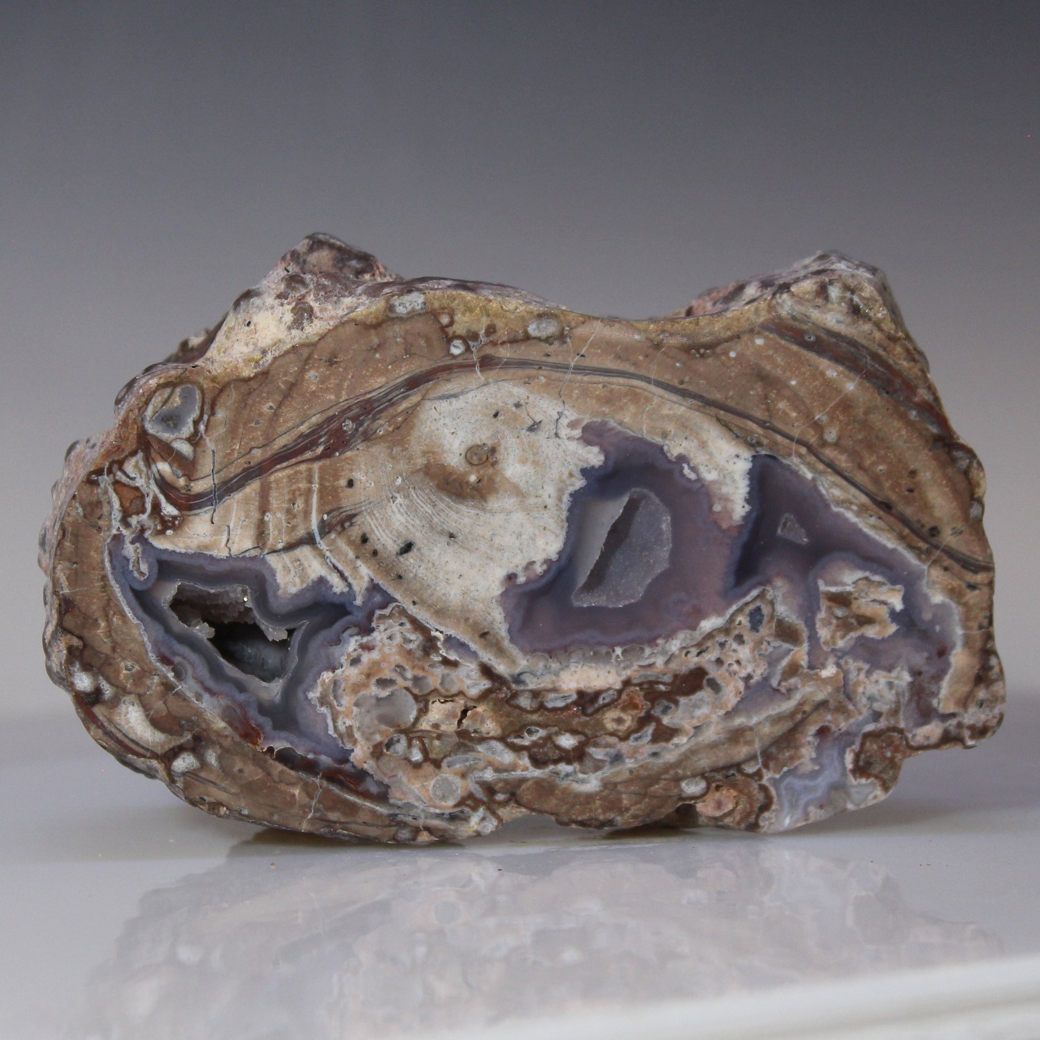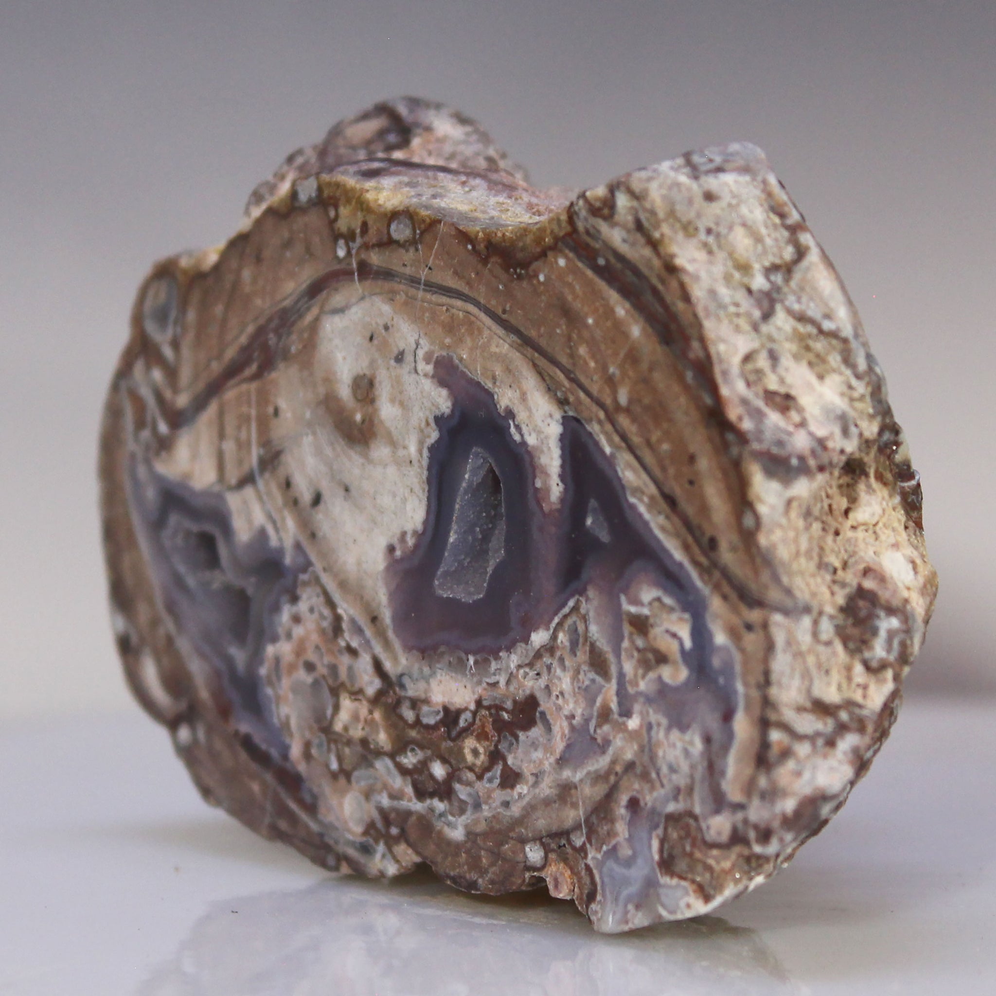 This is a Blue Dugway Geode with 2 mini chambers. Magnifying the chambers reveal a world of druzy coating of crystal points, so fine they almost look like velvet. The chambers even have boytroidal lumps.Some of the blue stone has a transparency that looks like pond ice. Also referred to as a 'Thunder Egg', this geode, as with all my Dugways, is from the finest beds of geodes in Utah known as the Juab Formation. I buy these directly from the miners who excavate them.