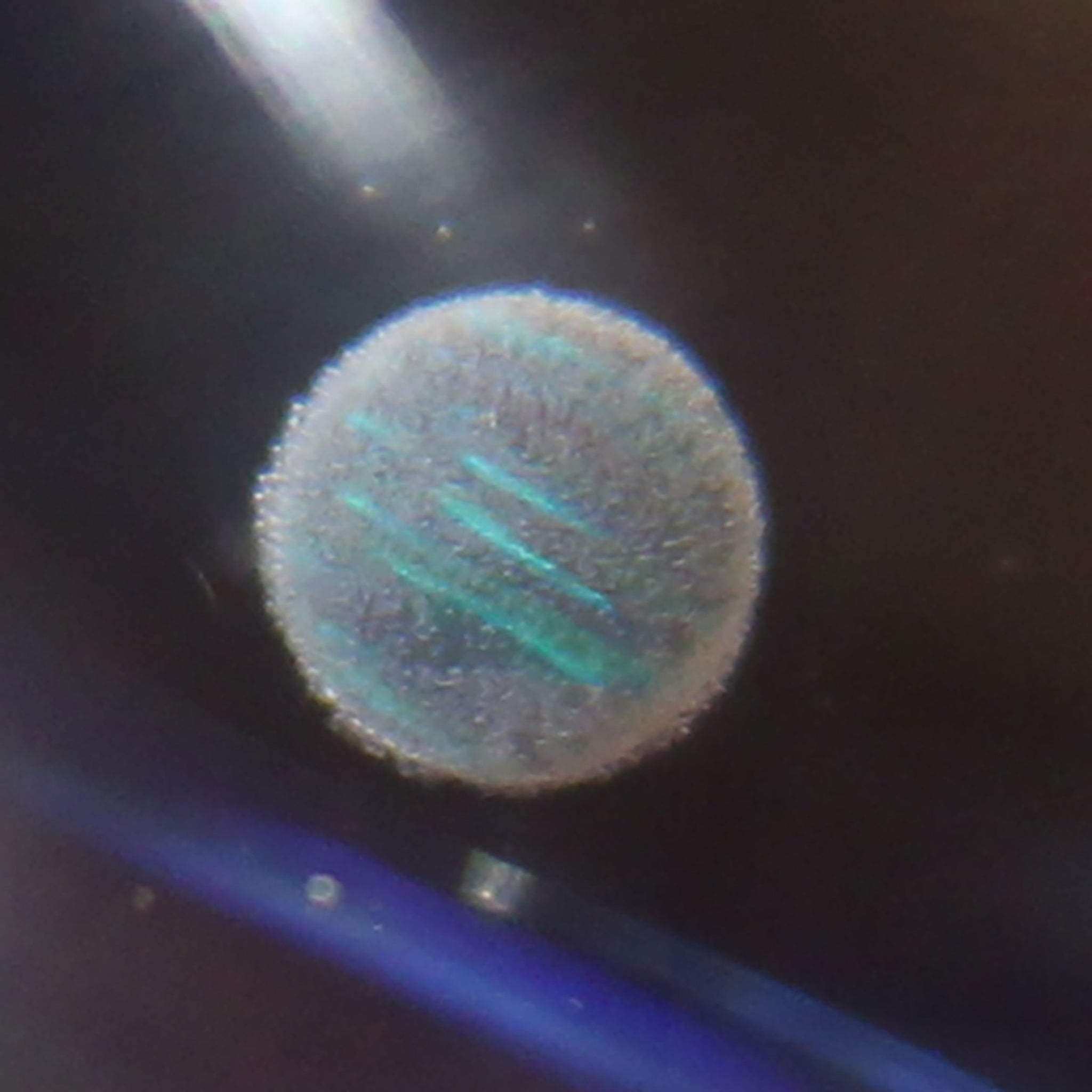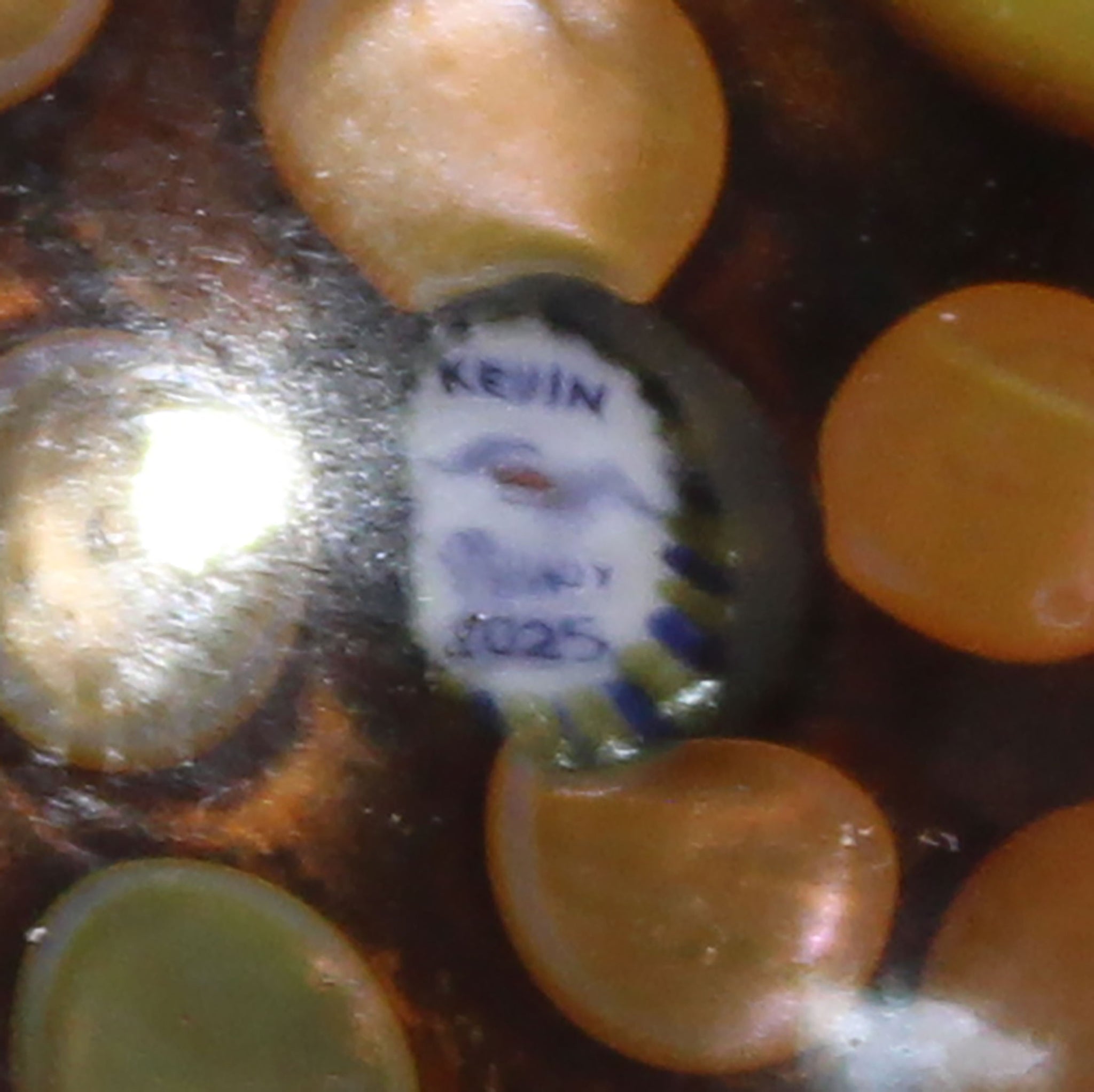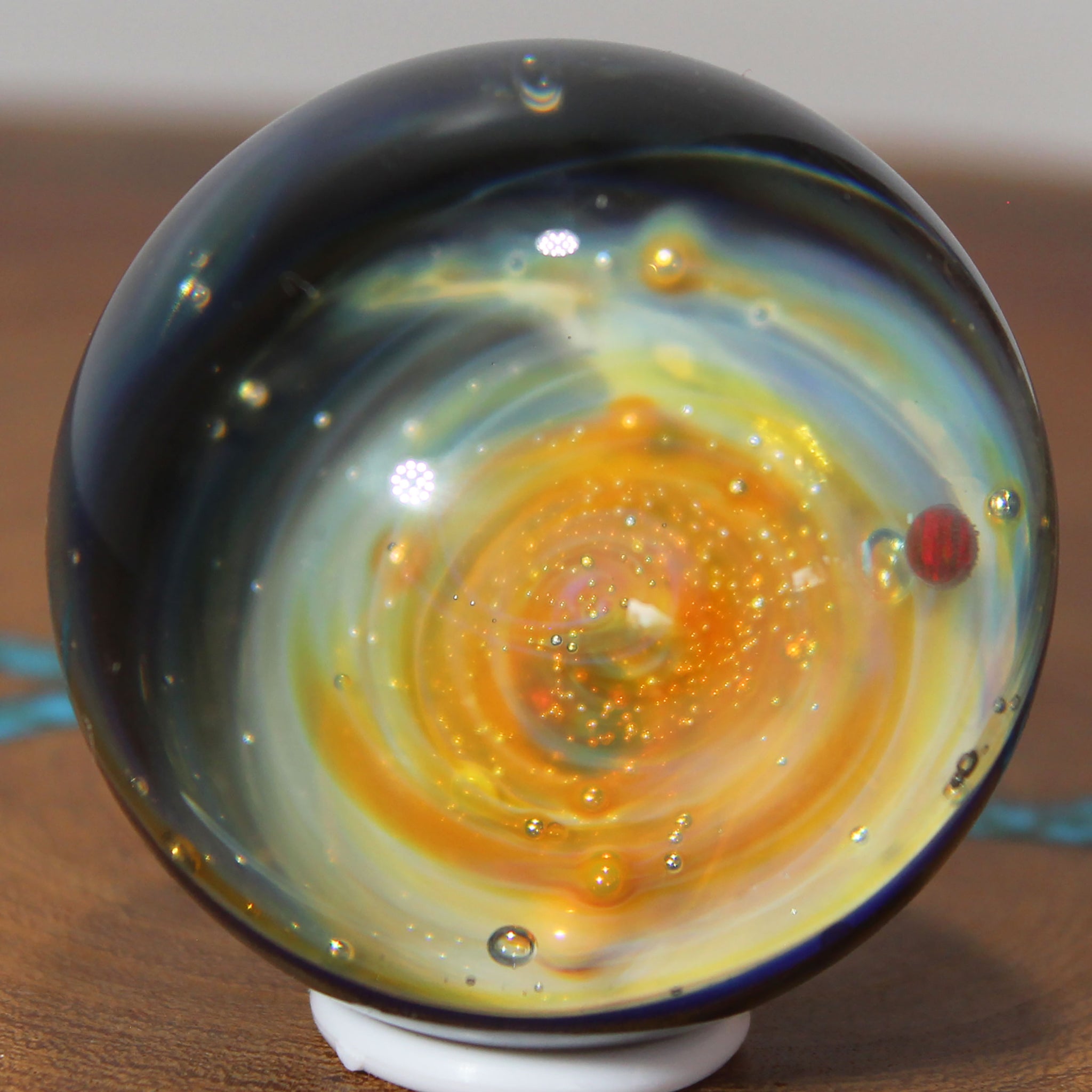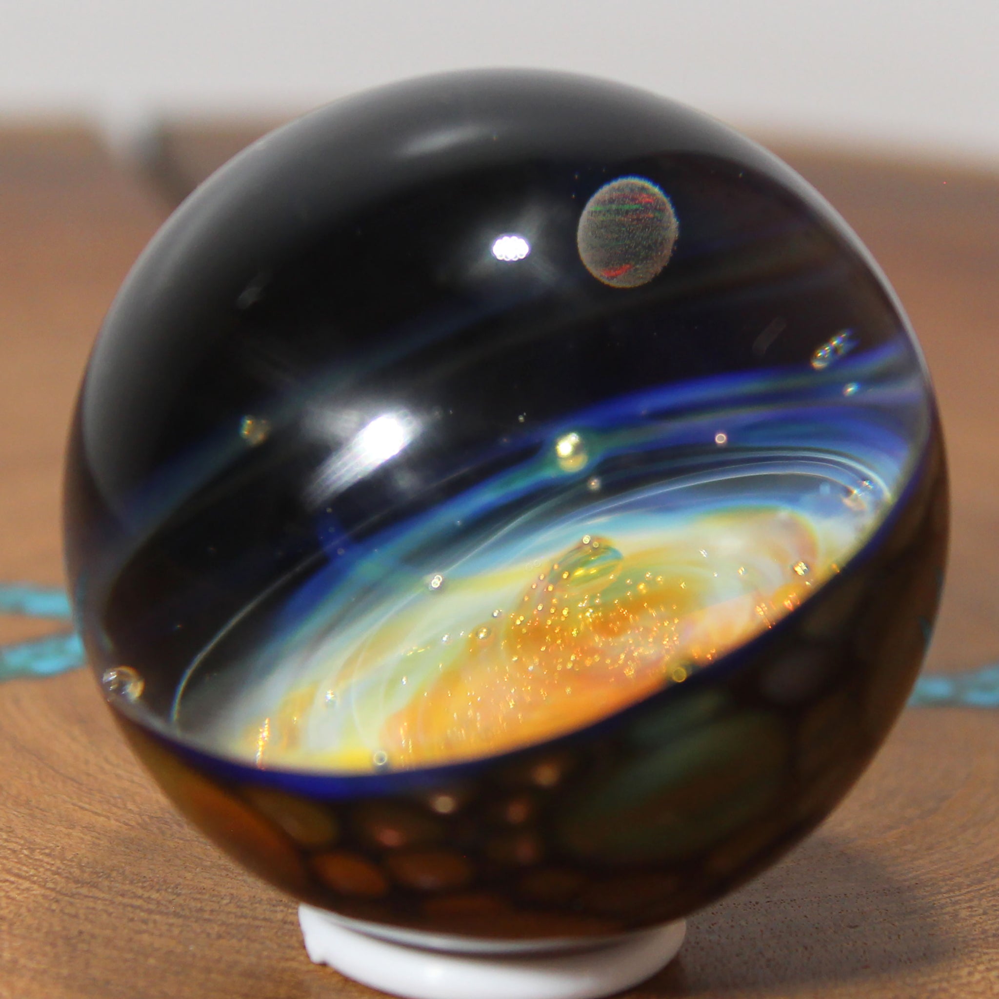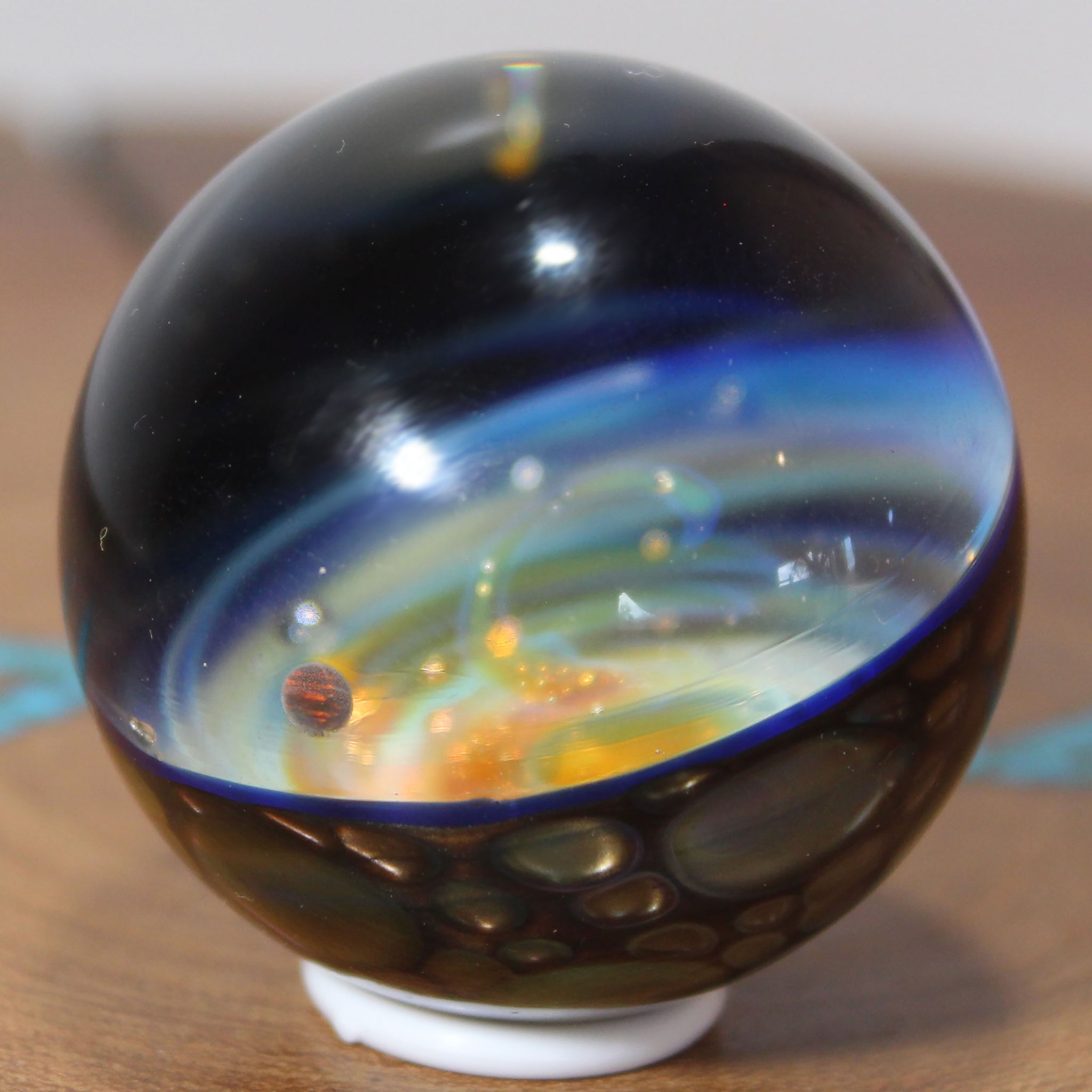 This marble is a first for me to present, and a new process for Mr. O'Grady. A galaxy is in your hand when this is held. A orbiting planet above the galactic plane switches shades of metallic color with just the most minor change in position. Even more wonders hide beneath the galaxy, visible when viewed from oblique angles. This borosilicate is the ultimate material for creating the clearest, most brilliant, liquid-like transitional orb possible. This borosilicate is the ultimate material for creating the clearest, most brilliant, liquid-like transparent orb possible. The underside is a kaleidoscope of millefiore ensemble pieces creating unique one-of-a-kind orbs.