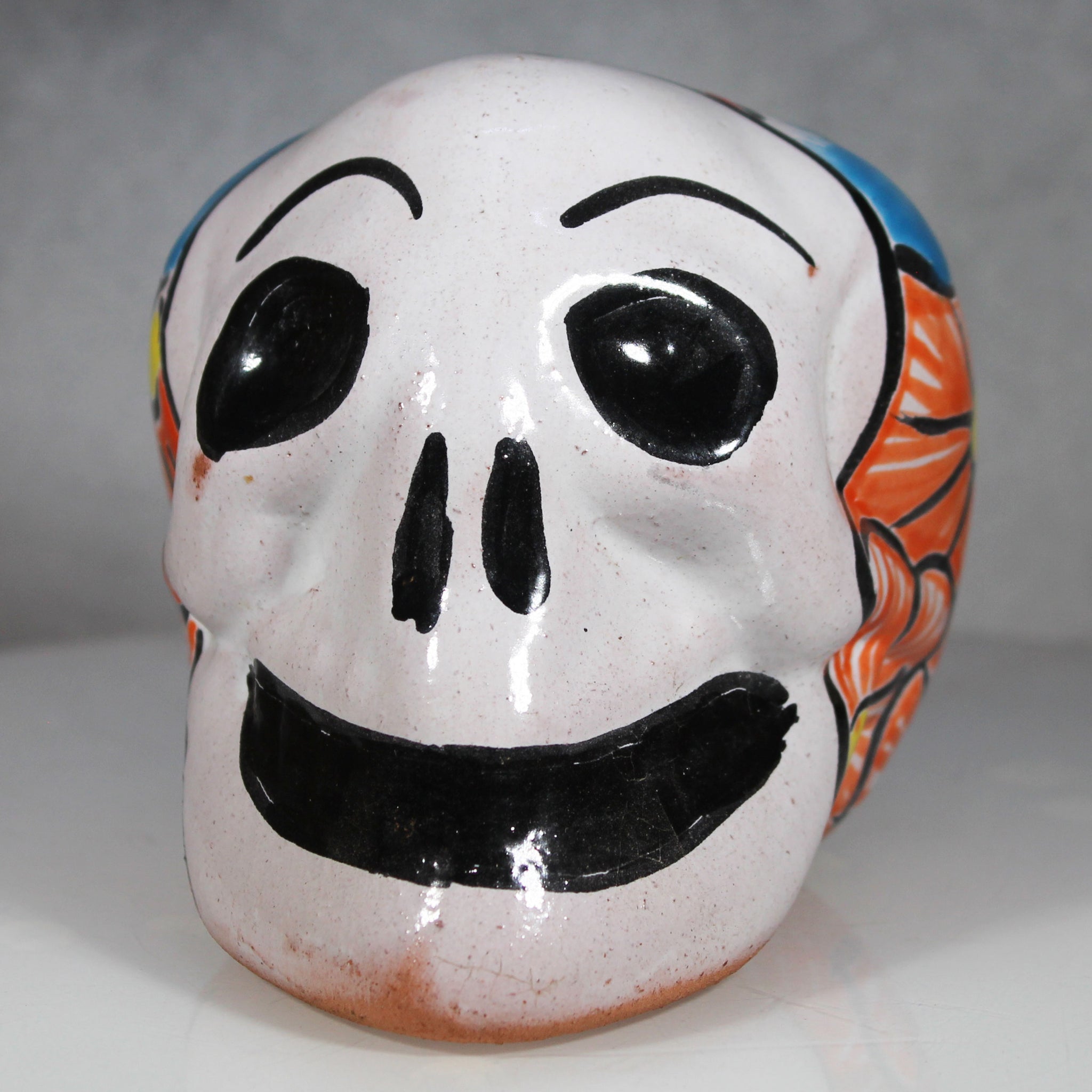 This Skull is brightly hand painted with traditional holiday designs from our neighbors to the south. Figures like this skull are a common sight in southwester home gardens and patios, including my own. This Latin American Talavera artwork, which ever style is displayed, enhances the beauty and status where ever it is used.