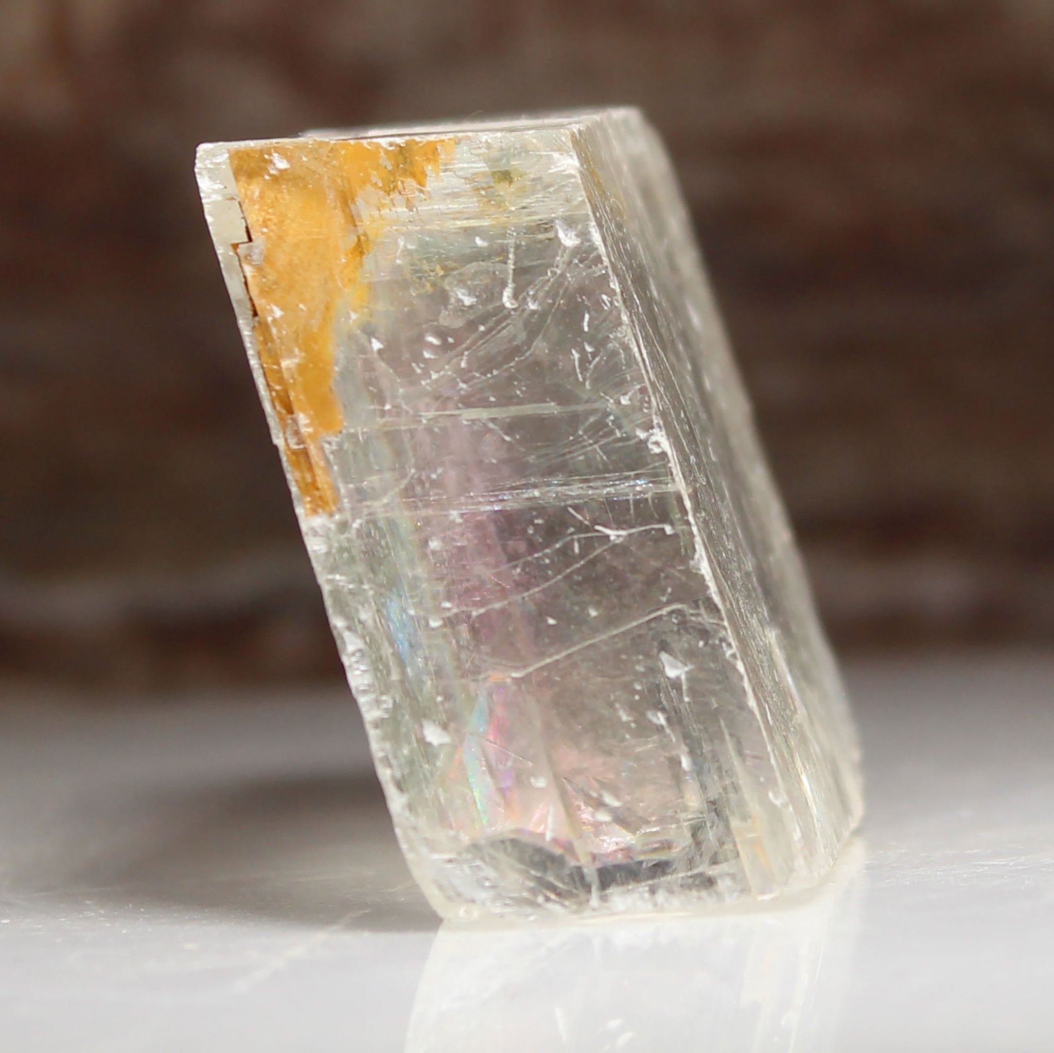 The Iceland Spar Crystal is notable for its unique leaning form and the phenomenon of double refraction. When held in the right light, it reveals a brilliant color spectrum, displaying all the colors of the rainbow. The crystal's molecular structure causes images seen through it to appear doubled, a feature that can be observed in the accompanying photograph.