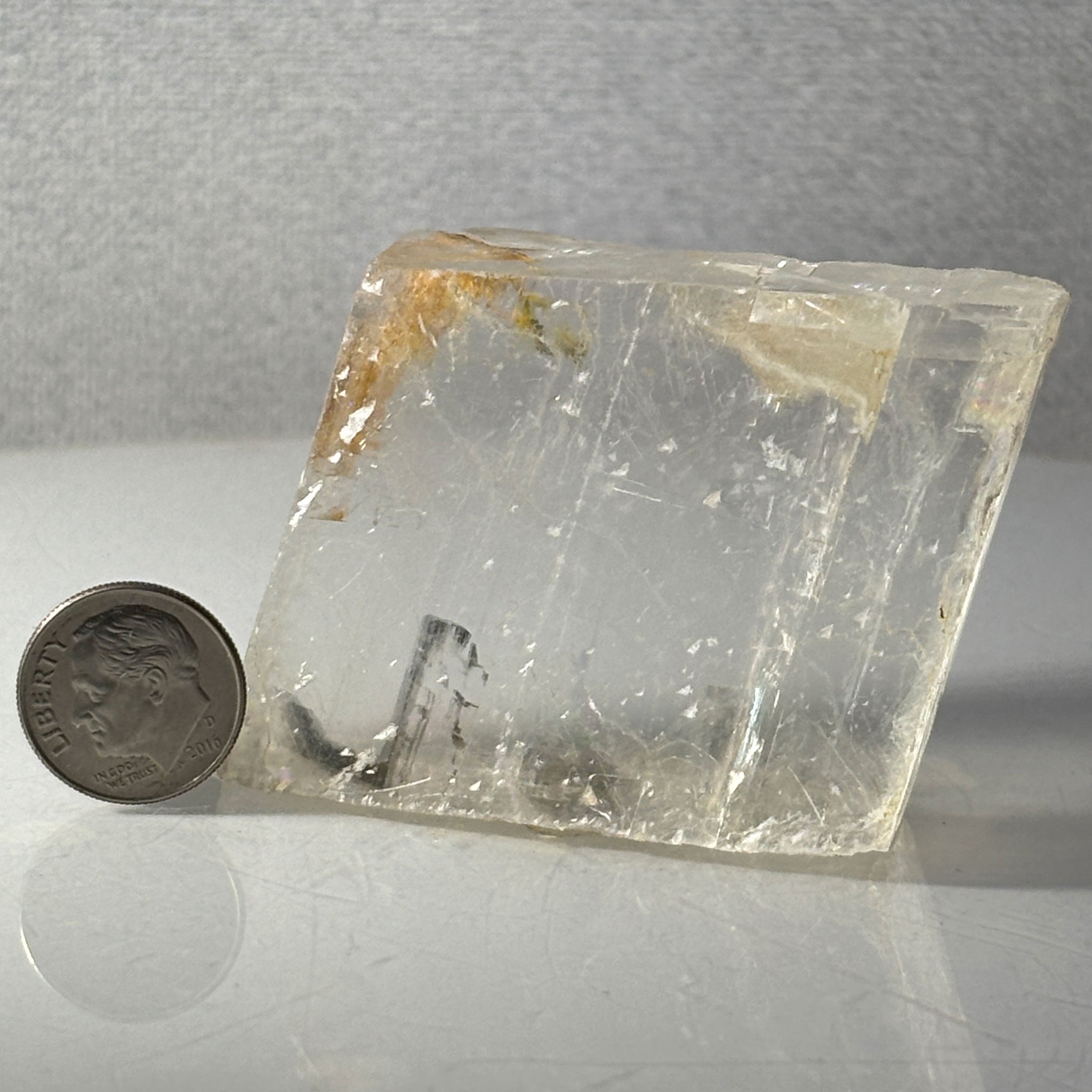 This Iceland Spar Iceland Spar Crystal Rhombohedron with Double Refraction weighs 4.5 ounces and measures approximately 2.25 inches in length, 3/4 inch in depth, and 1.75 inches in height. Its distinctive shape is a rhombohedron, resembling a leaning rectangle.