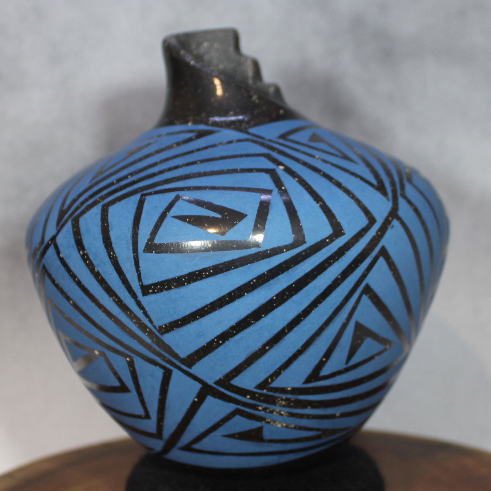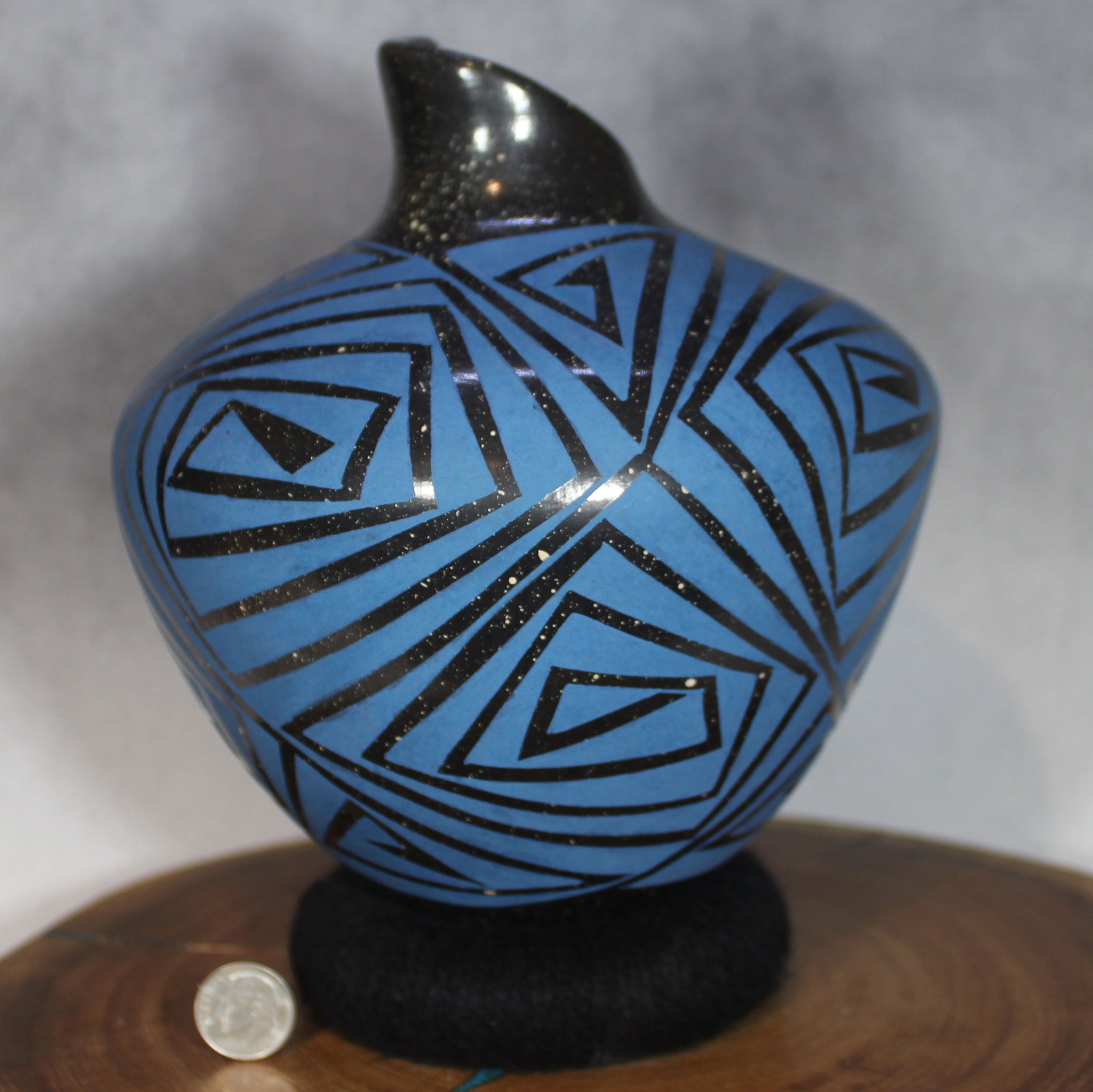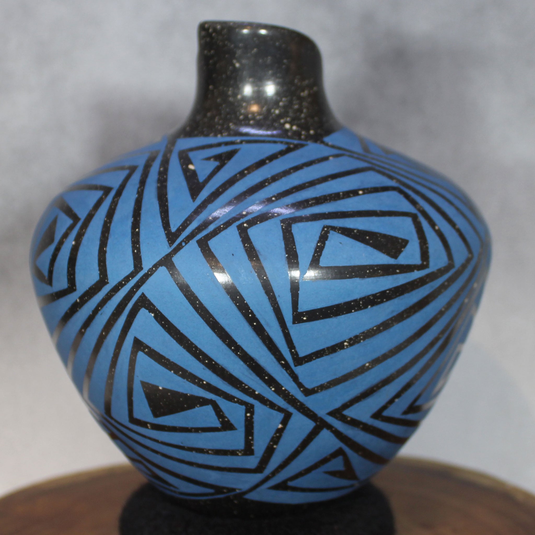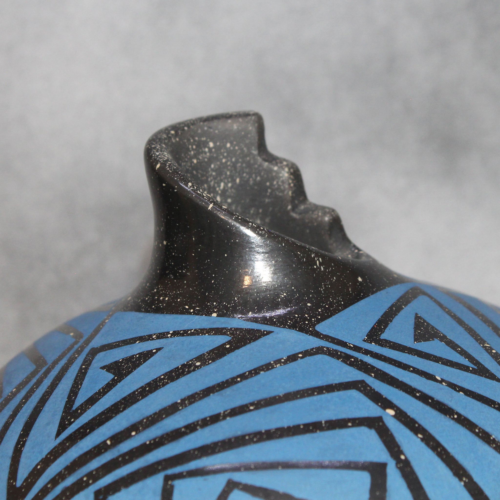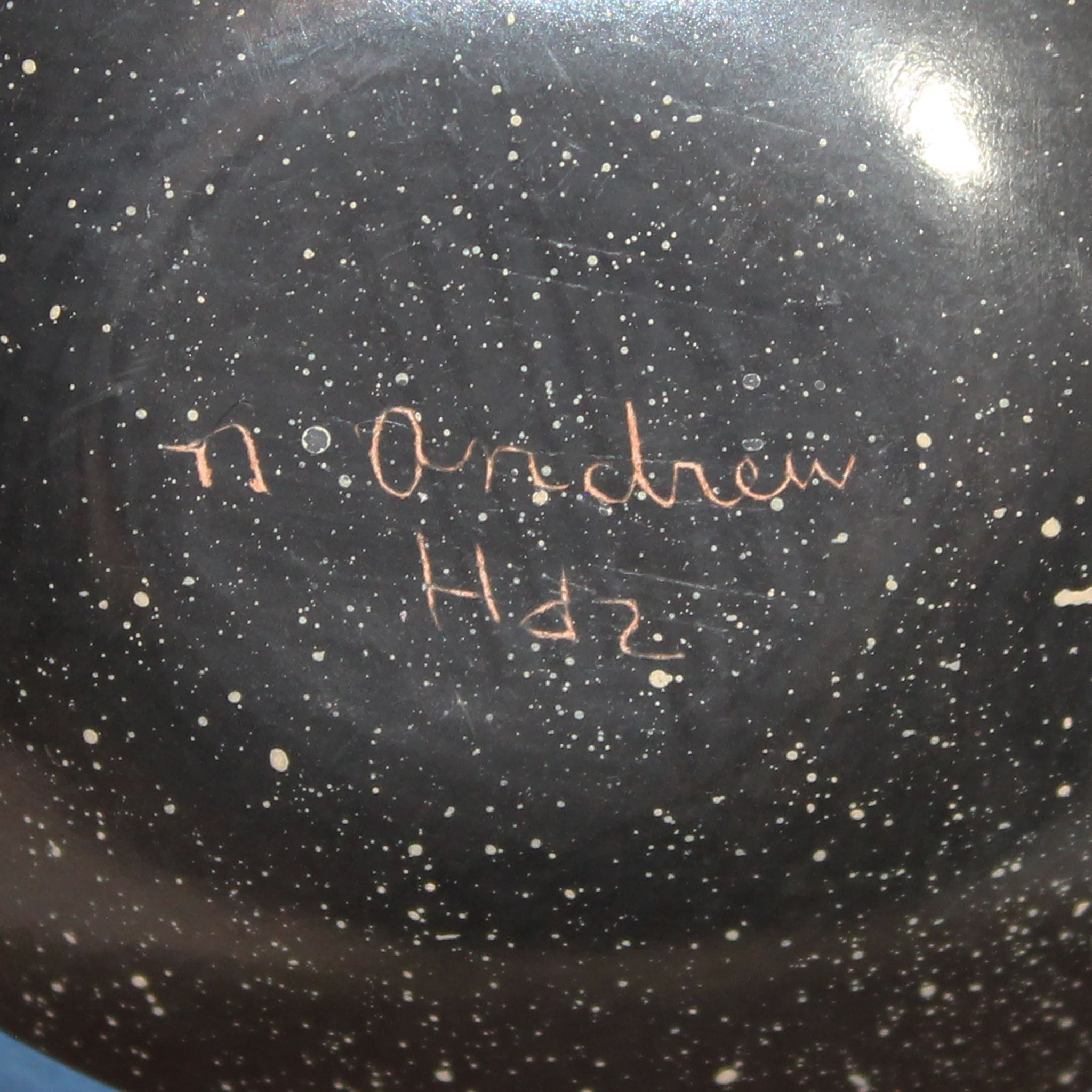 Artist N. Andrew Hernandez is the genius behind this pottery. As with all pottery coming out of the artist colony of Mata Ortiz, this is handmade without the use of a potters wheel. There is a stair step neck. On a hand smoothed surface, Señor Hernandez uses two shades of glaze, and good amount of time and ingenuity, to create this beautiful folk art. And to cap it off, white glaze has been lightly dappled across the entire surface. Artist Hernandez abilities in pottery design are known far and wide. This piece is wonderful and intense with its bold use of the contrasting glazes. The designs are sharp and flawless.