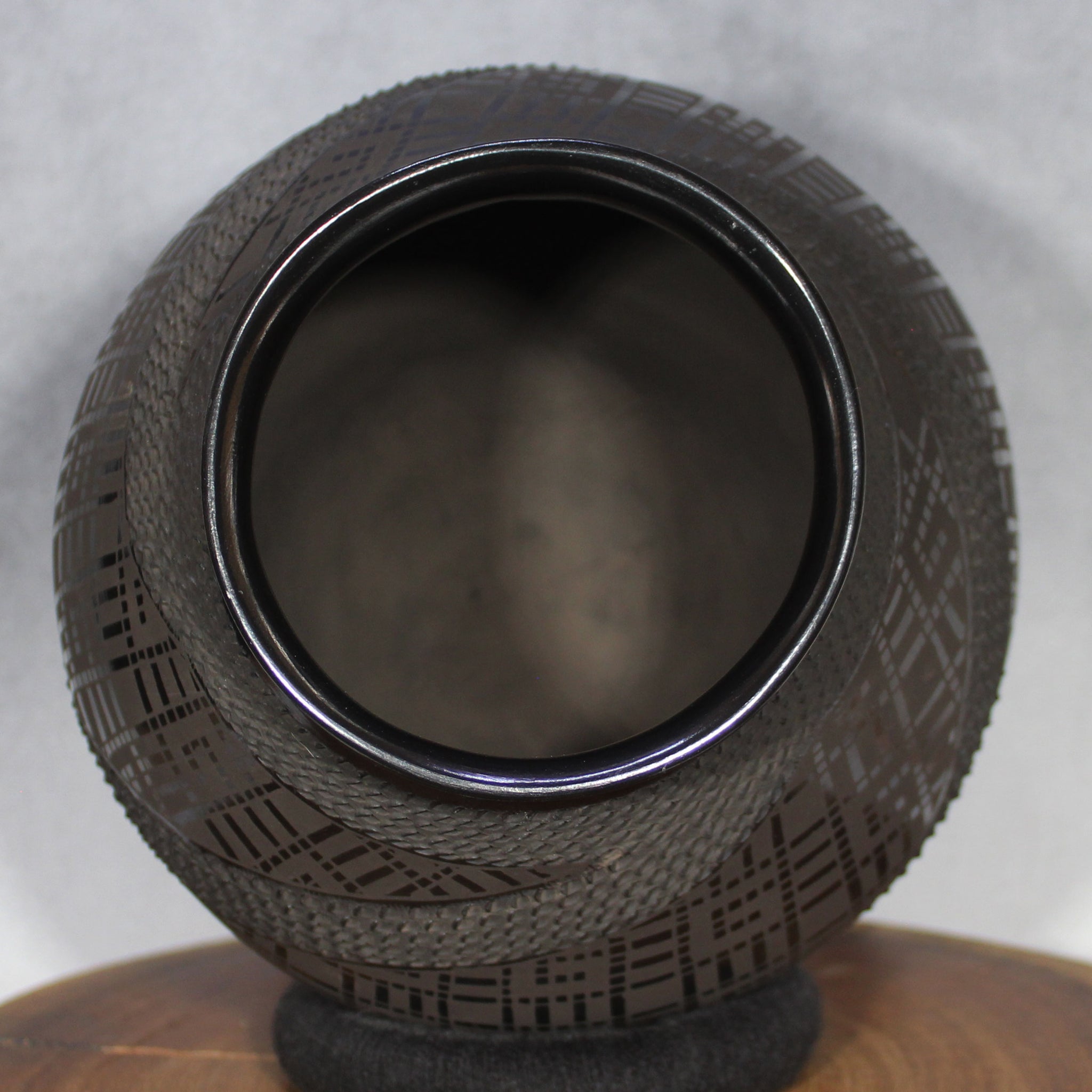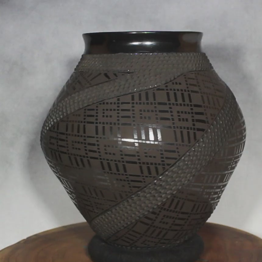 Señor Sandoval is renowned for his talent in working with black clay. Not only are his skills superior in creating the finest details in metal and matte finishes, he is also known for his ability to create complex, textured patterns. In this instance he has created sashes from finely repetitive tic - or corrugated marks, one after another into the the thousand. In addition, the ancient and prevalent Paquime block design has also been incorporated, resulting in a stunning, finished effect.