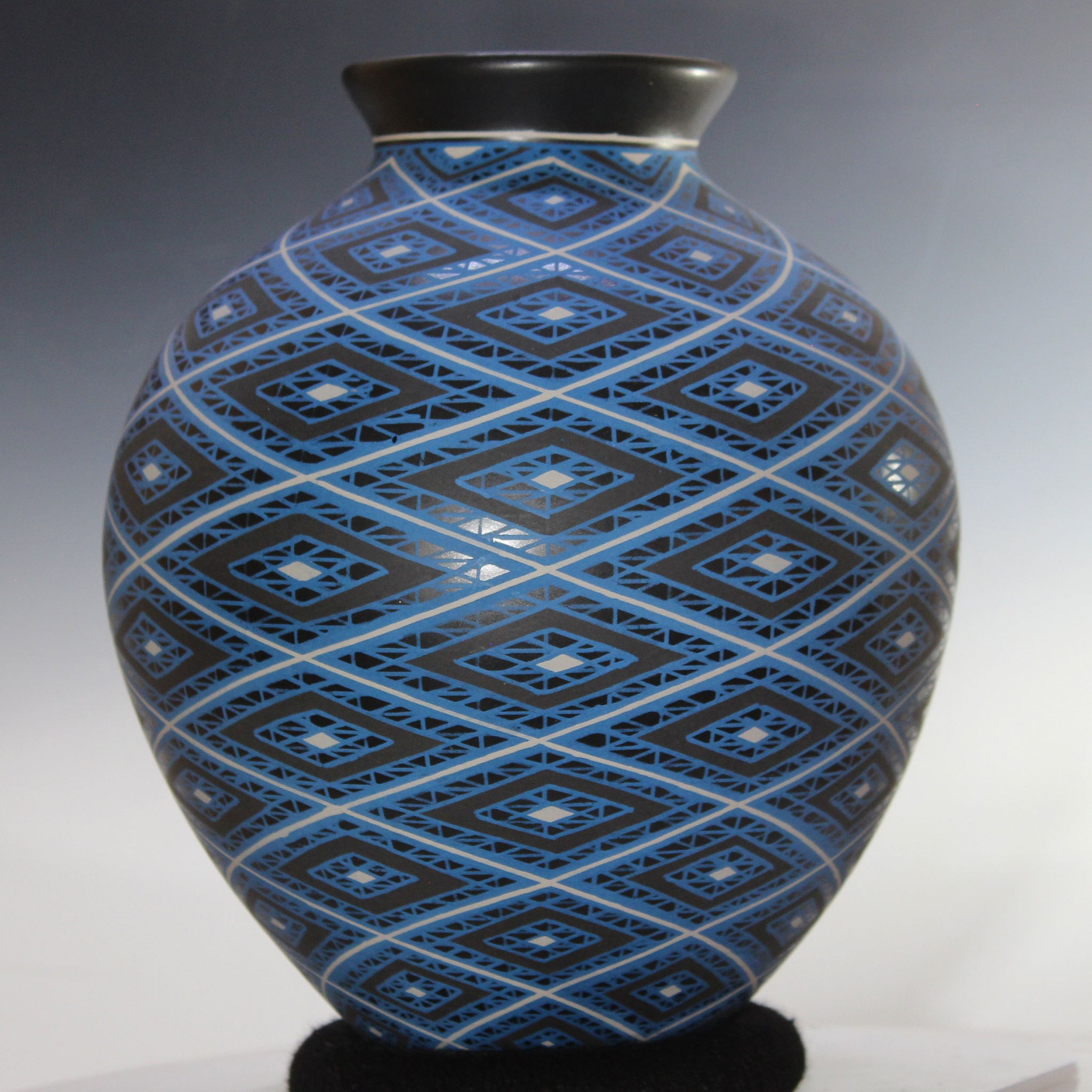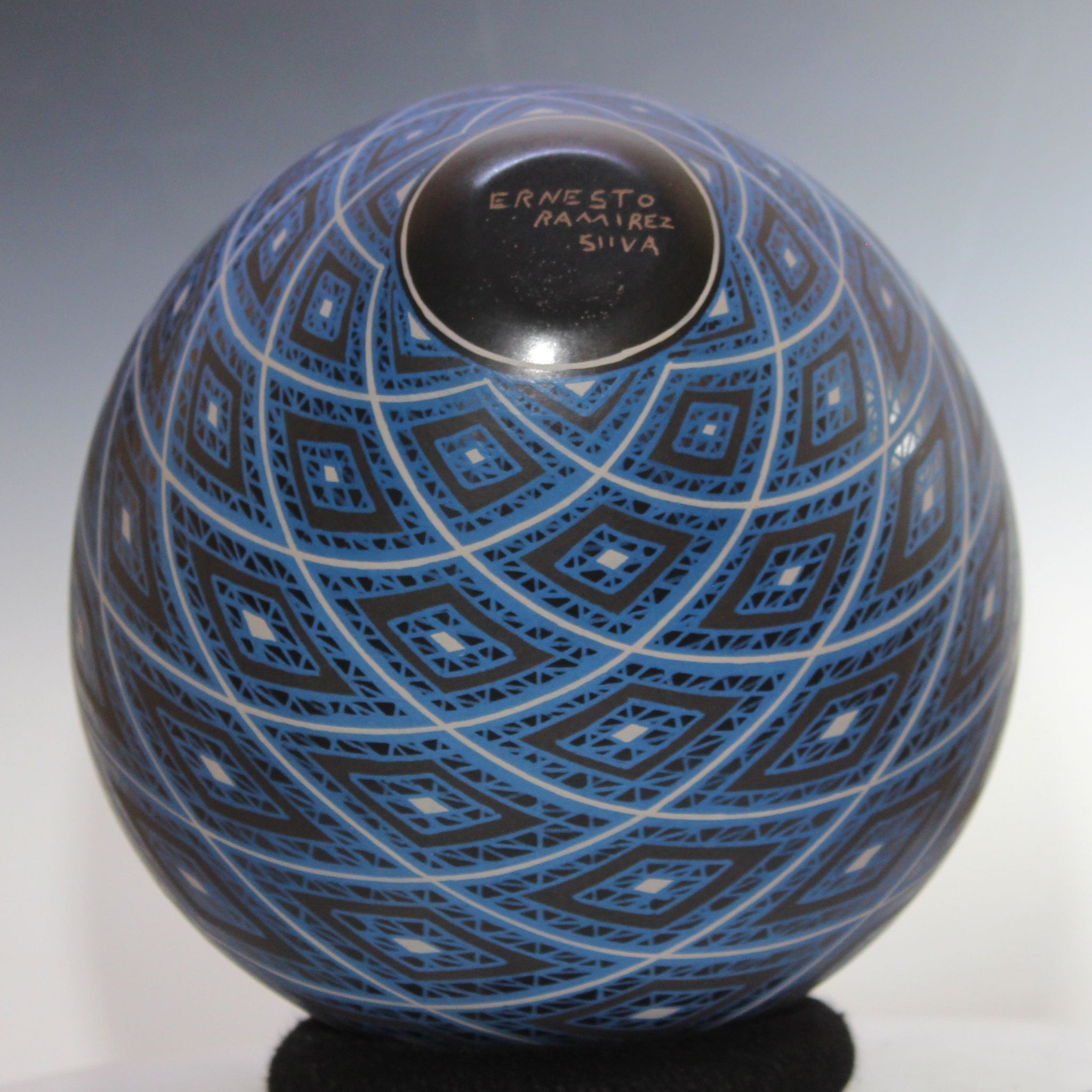 This Mata Ortiz Pottery with Blue Diamond Pattern possesses Señor SIlva's unique style. There are bold, complex, and contrasting diamonds of rich blue, black & white glaze. These are painted on a black clay surface for the most dramatic contrast, and are paradoxical to the simple and smooth roundness of the container. Viewed from the top or from the sides, every angle is a kaleidoscope of southwestern form; every angle is Señor Ernesto Ramirez Silva.