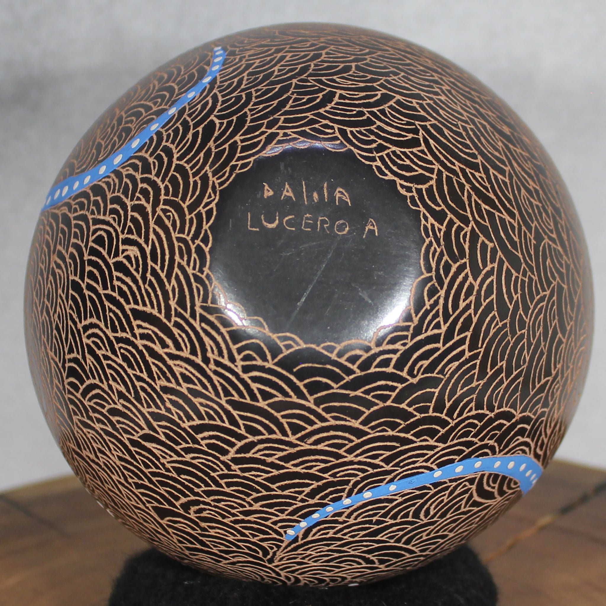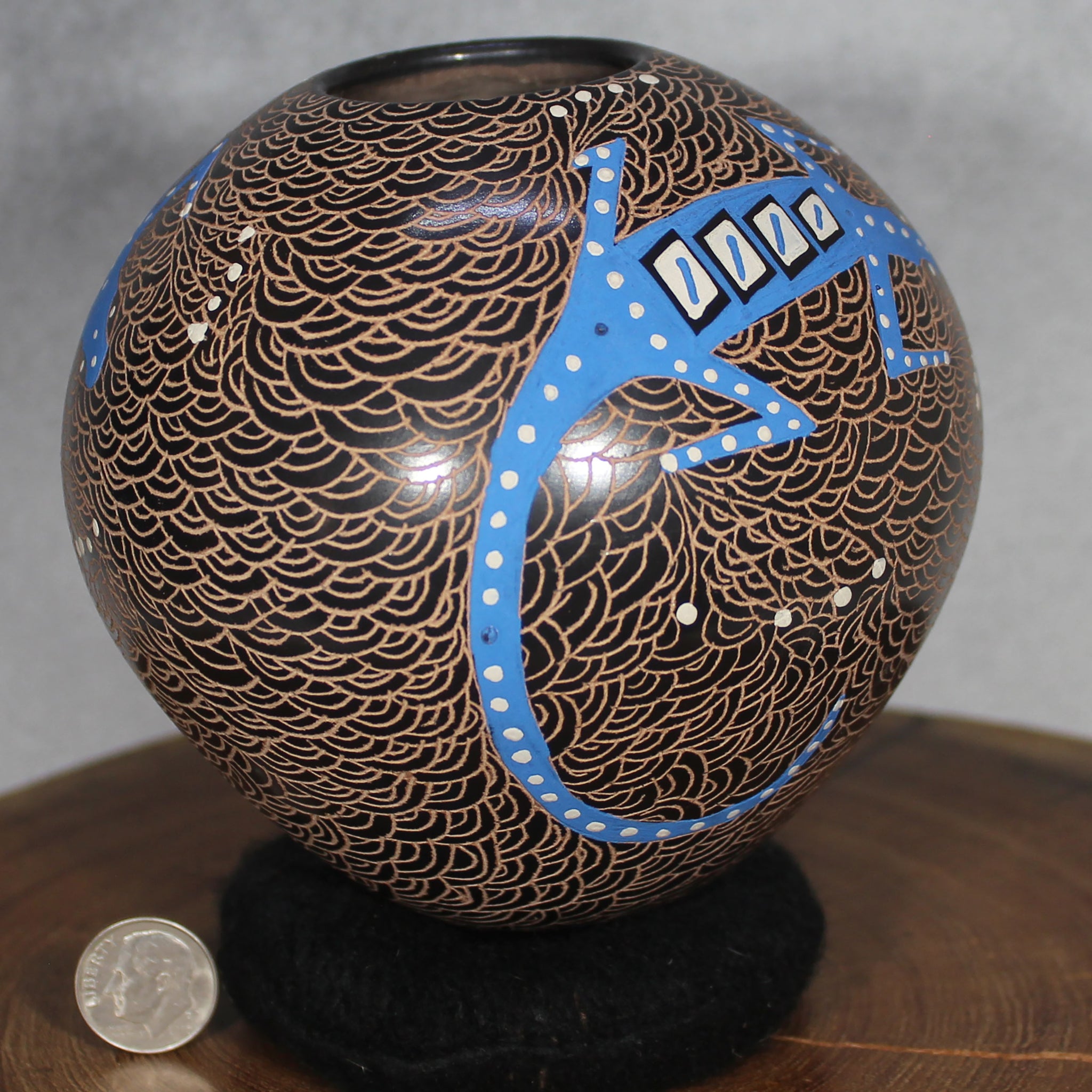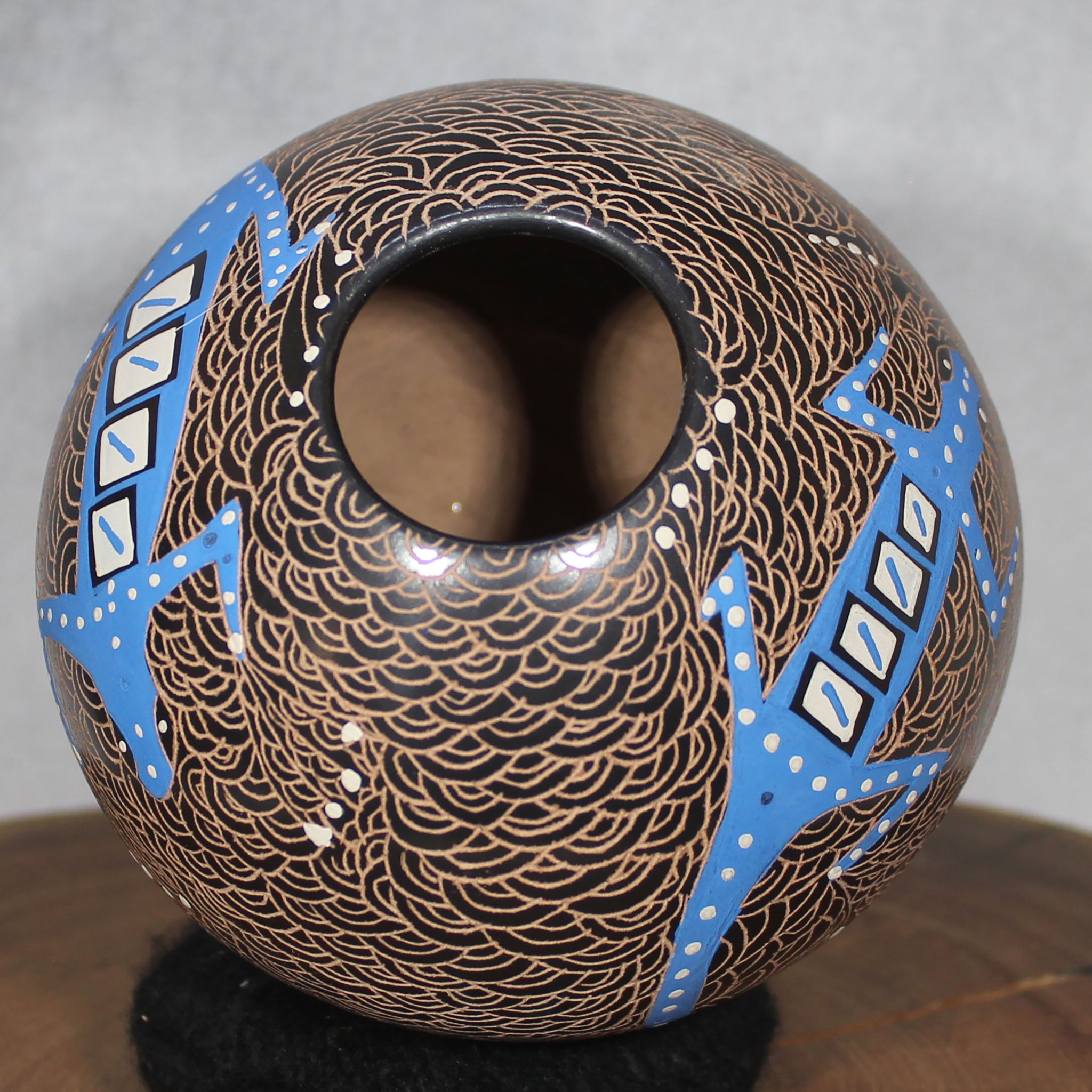 This beautiful, native gourd-sized pot is crafted by the artist Ms. Delila Lucero. Her distinctive style is recognizable for its bold contrasting blue and brown. Her etching style produces sharp edges and pronounced details, as demonstrated in this piece. Like much of the pottery from Mata Ortiz, her work is deeply influenced by the ancient ancestors of the village. In this instance, the influence is evident in the overlapping, scale design featured in the background. Also, Ms. Lucero creates a contemporary style lizard with ancient Paquime squares along its back, creating another melding of ancient with contemporary.