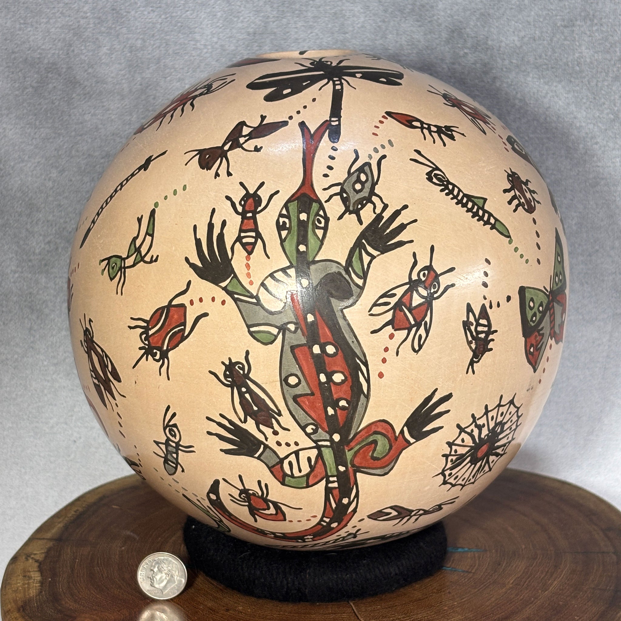 The pottery includes depictions of grasshoppers, ants, ladybugs, spiders, dragonflies, and numerous other critters that are difficult to identify. Additionally, crabs and snails are represented, ensuring that nearly every creature is included in this vibrant scene.