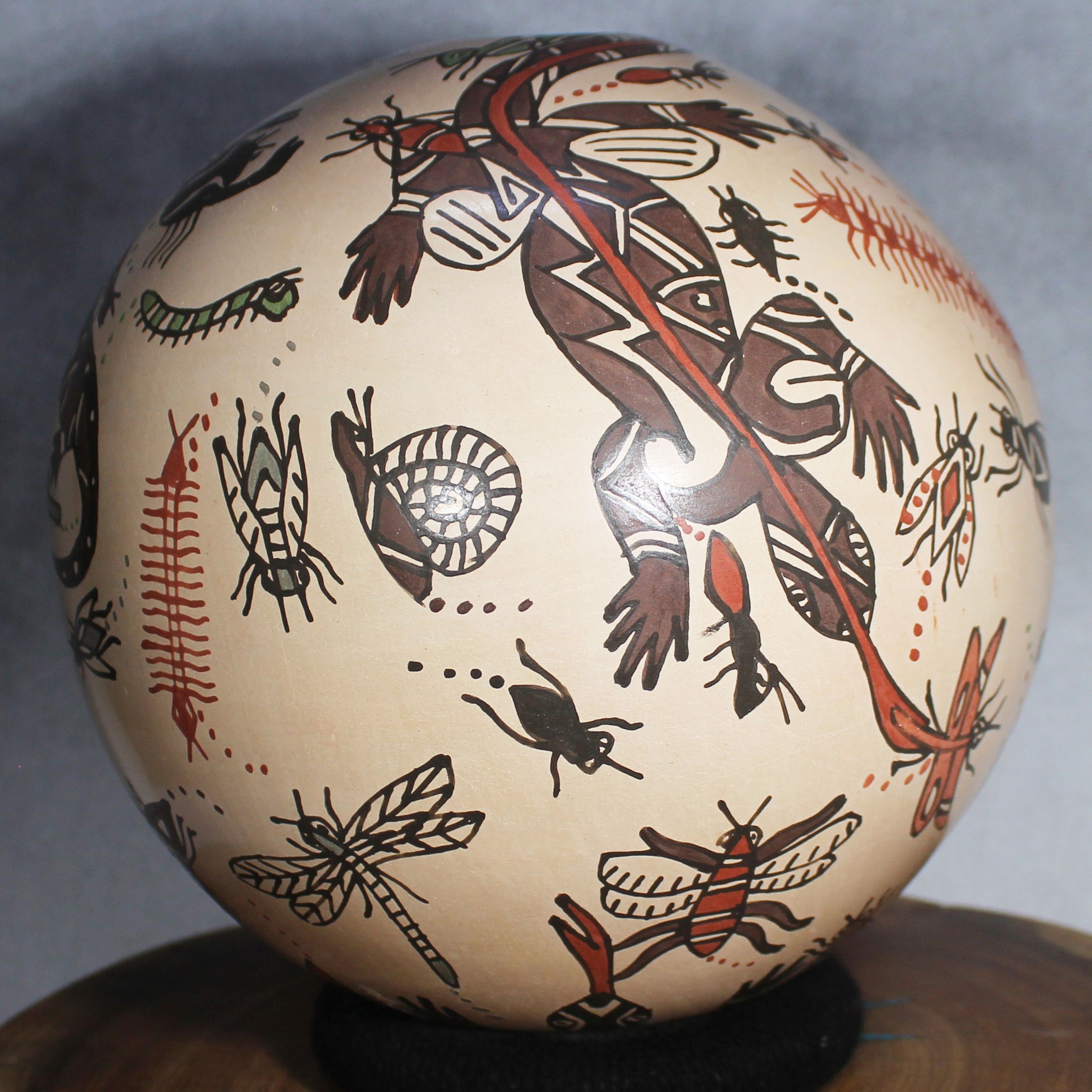 Three prominent lizards are illustrated scurrying across the pottery, each seeking their next meal. Notably, one lizard’s tail wraps around the pottery’s opening, adding a whimsical touch. Altogether, there are dozens of small creatures traversing the surface. The artwork features black, green, and brick-red glazes painted over an eggshell-white glaze, bringing these denizens to life in intricate, playful detail.