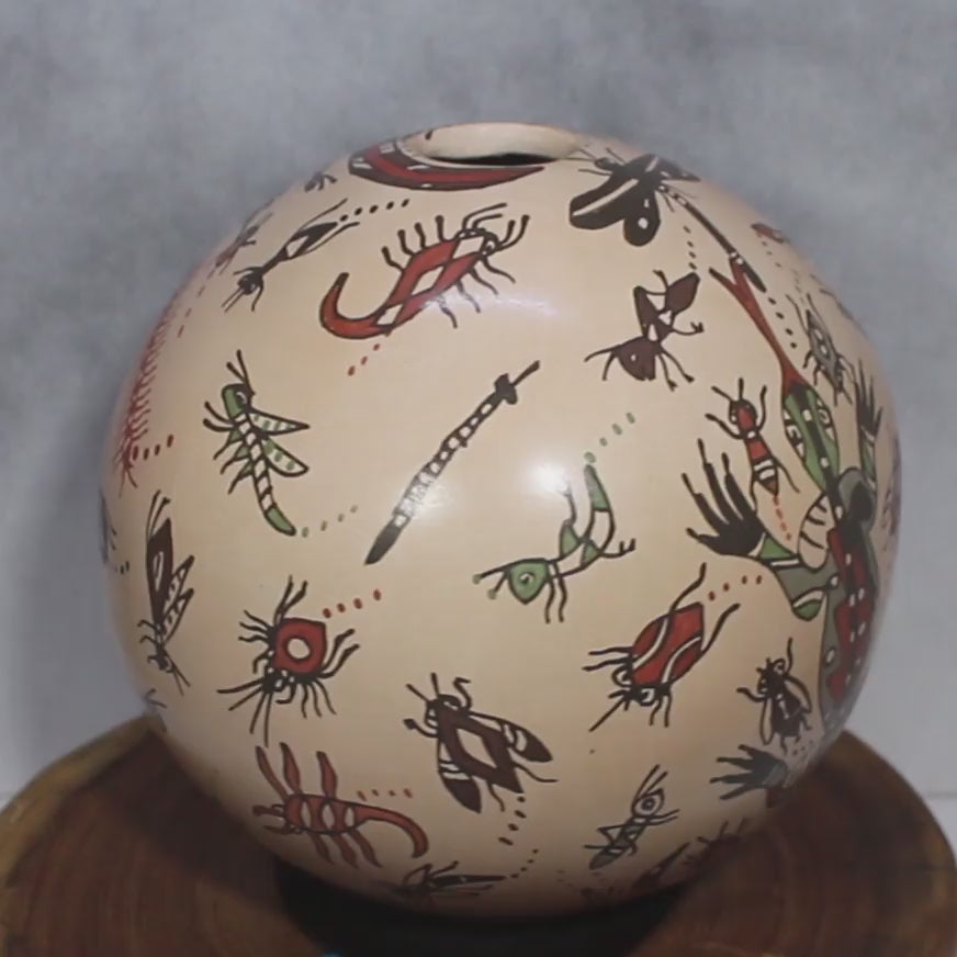 This pottery piece is adorned with a wide variety of bugs and reptiles, all artistically rendered to create a cheerful and lively atmosphere. The artist, Beto Reyes, depicts these creatures as friendly and harmless, fostering a sense of community among them. Rather than appearing frightening, the insects and reptiles are shown as happy cohabitants, sharing their space with the residents of Mata Ortiz.