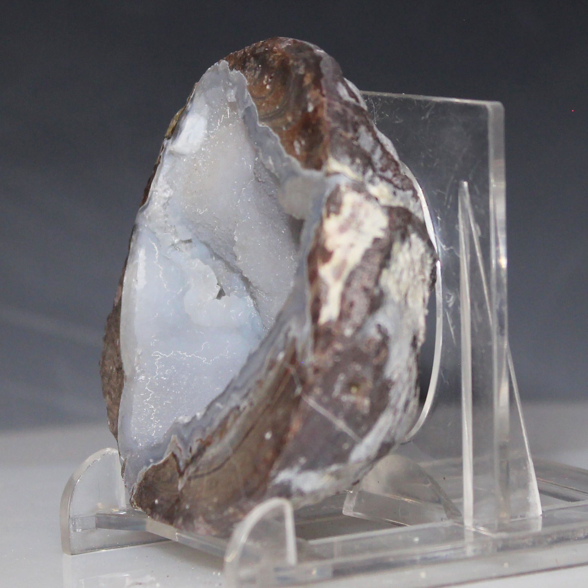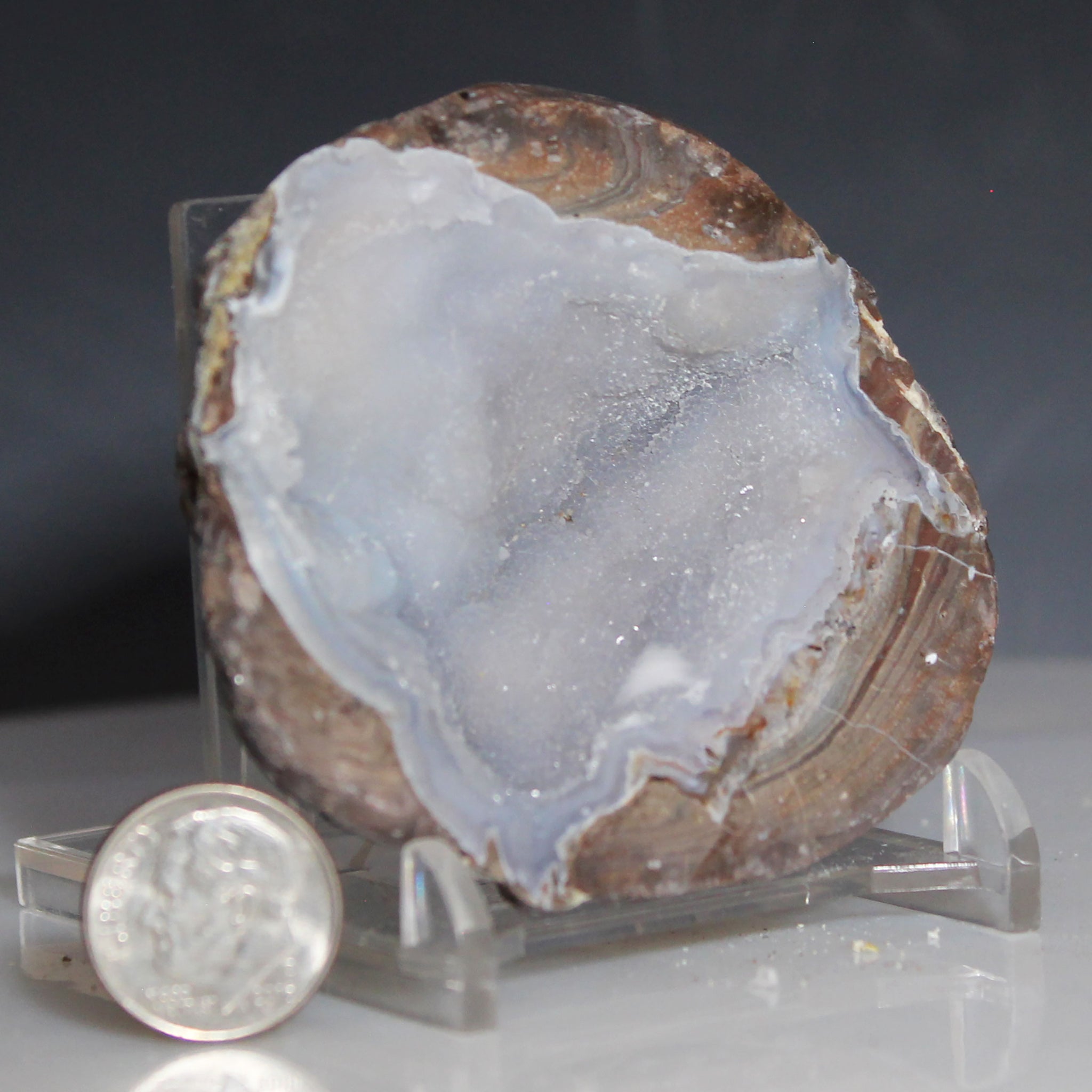 This is a well formed Dugway geode Oregon Thunder Egg, with one deeper, distinct chamber. The chamber has well formed boytroidal lumps inside with the finest coating of druzy quartz covering them. Also referred to as a 'Thunder Egg', this geode, as with all my Dugways, is from the finest beds of geodes in Utah known as the Juab Formation. I buy these directly from the miners who excavate them. An acrylic stand is included for displaying this crystal.