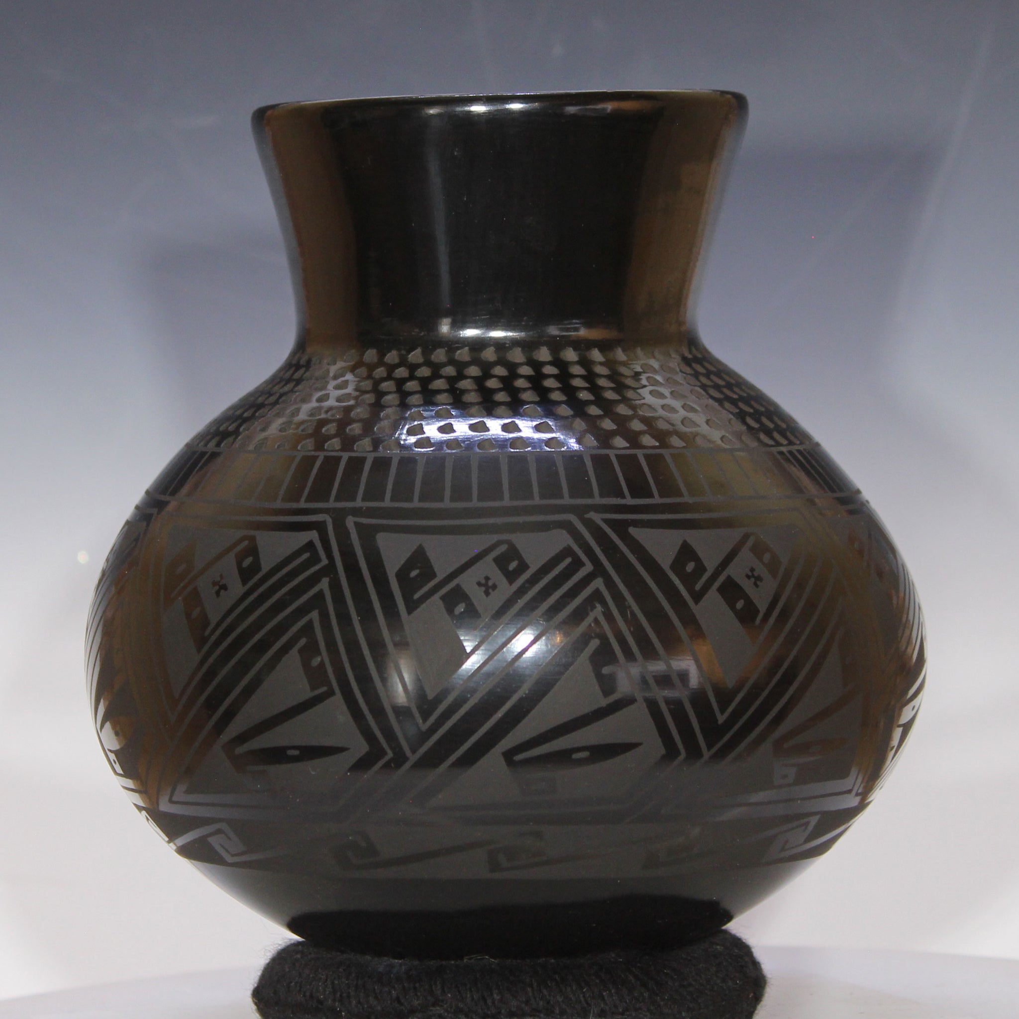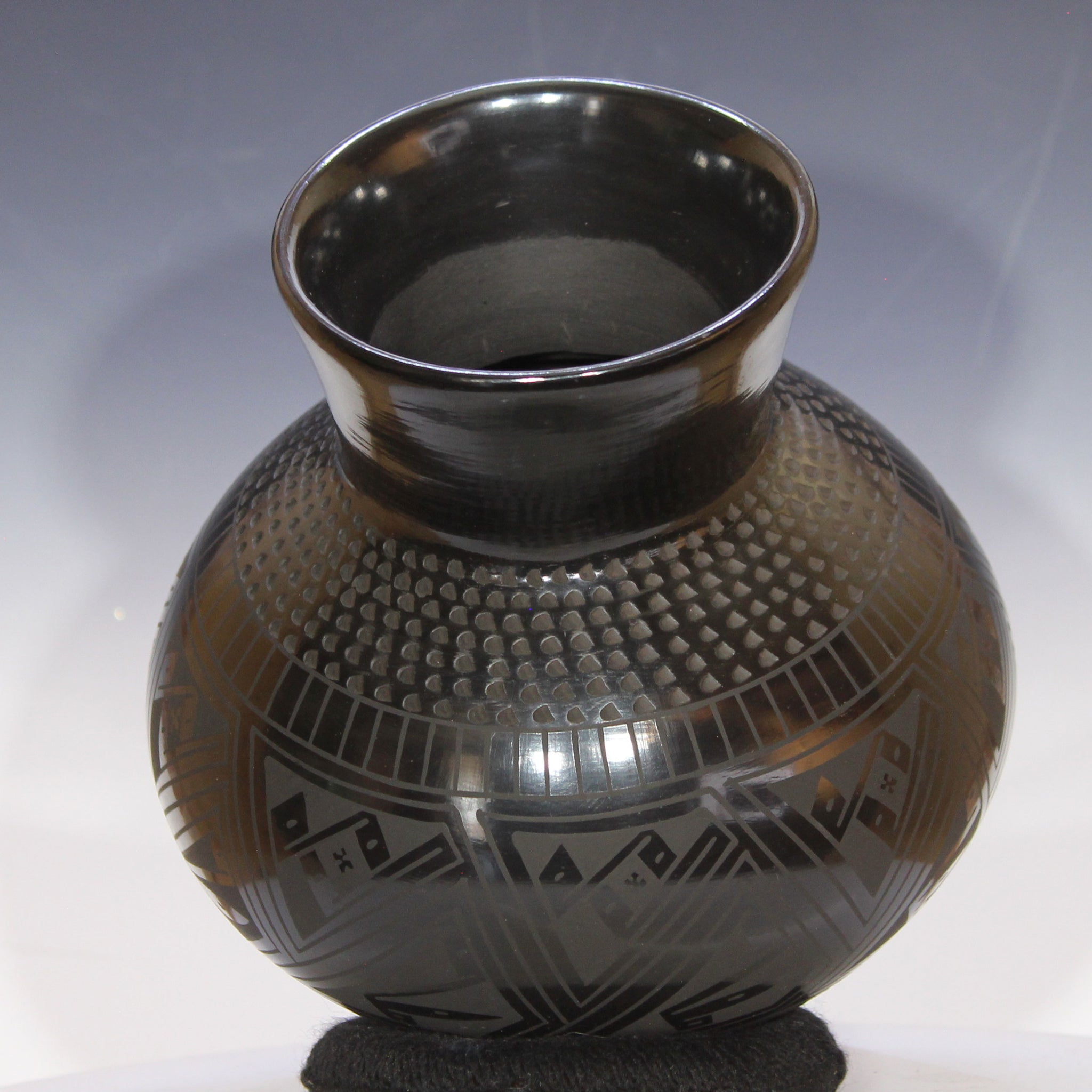 Artist Tomasa Mora has hand crafted this lovely and graceful pottery. With a rounded form, long neck and wide mouth, the style reflects tradition from one thousand years ago to her Paquime ancestors. They lived in the Casas Grandes region of Chihuahua Mexico. And, Ms. Mora has added some curved lines adding a contemporary feel. The glaze is stone rubbed to produce the black mirror finish. This is the deepest, richest shined black glaze found. The designs are heavy in geometric influences and stand out due to the finesse given in combining a matte finish with a mirrored finish. The collar is a band of design known as a 'tick' pattern. It is elegant and beautiful. Do not put water in this pottery.