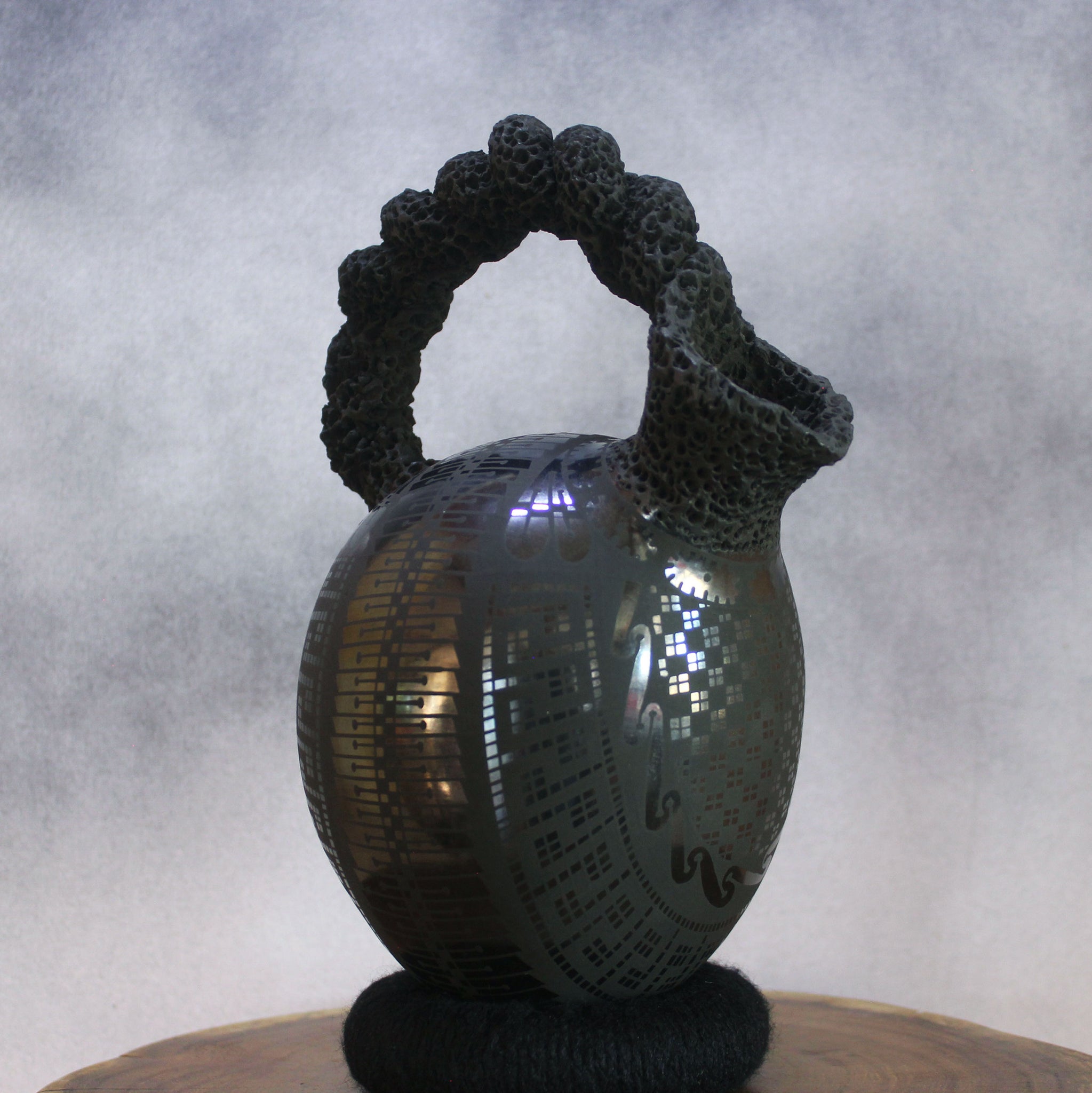 Here is a unique work of art crafted by Master Artisan Eli Ortiz. This pottery has a rope-like handle and one spout, serving as a pitcher (never fill this with liquid).