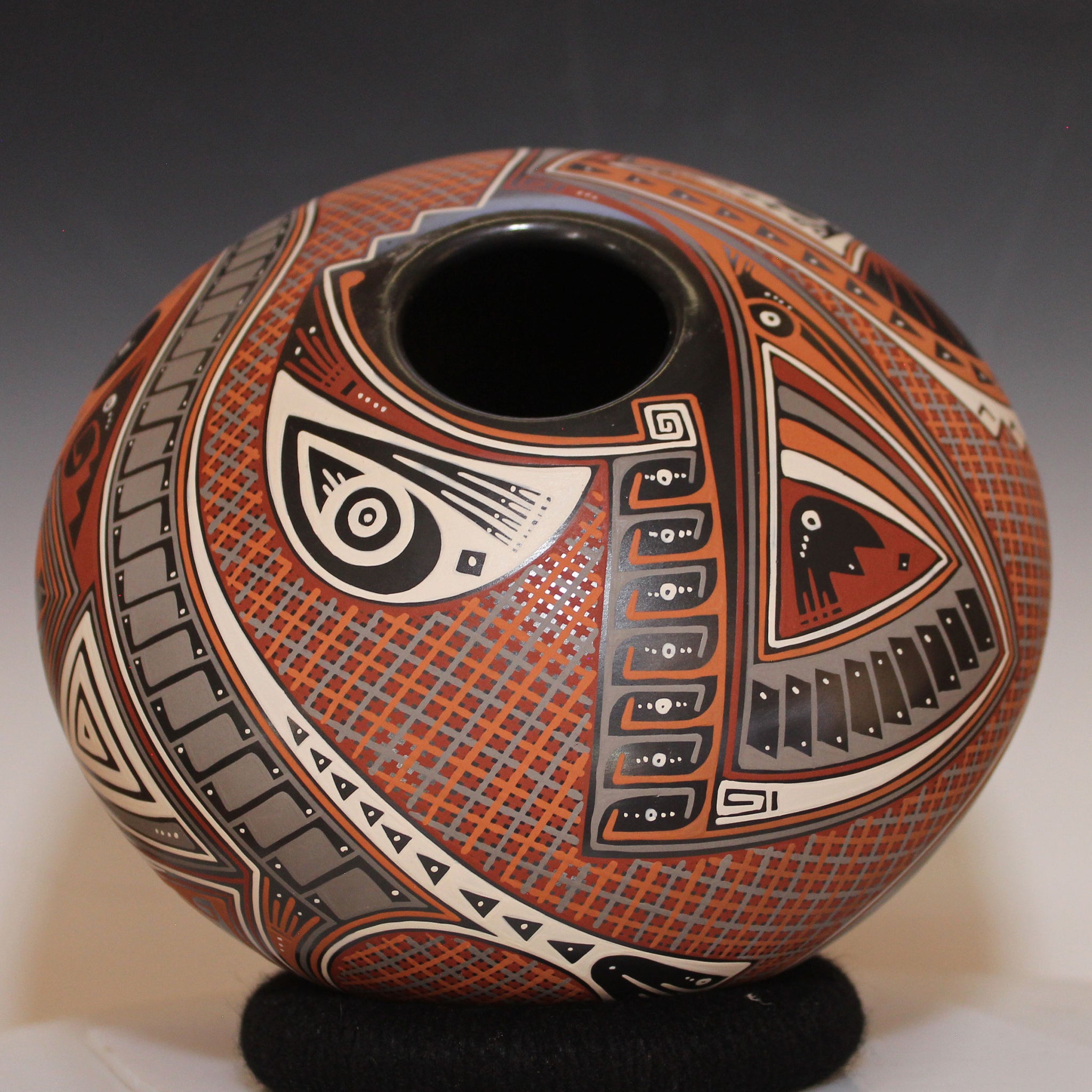 Master Artisan Ortiz is a top potter at portraying his own interpretation of the ancient Paquime cultural designs originating in the Mata Ortiz/Casa Grandes region. His scrolls, swirls, feathering and surreal patterns are highly valued for their intricate and intense flow, all hand painted in dynamic detail. 100% of the materials used to make these fine pieces are derived from the land surrounding Mata Ortiz. The soil types for the clay and the materials for dyes occur in unique blends only in this area of Chihuahua. This is created by hand, with great precision and detail of use of the natural, native glaze. In some cases on the designs are near microscopic scale, are are indeed wondrous. The artists skills are ultimate and the time to create his works is immense.