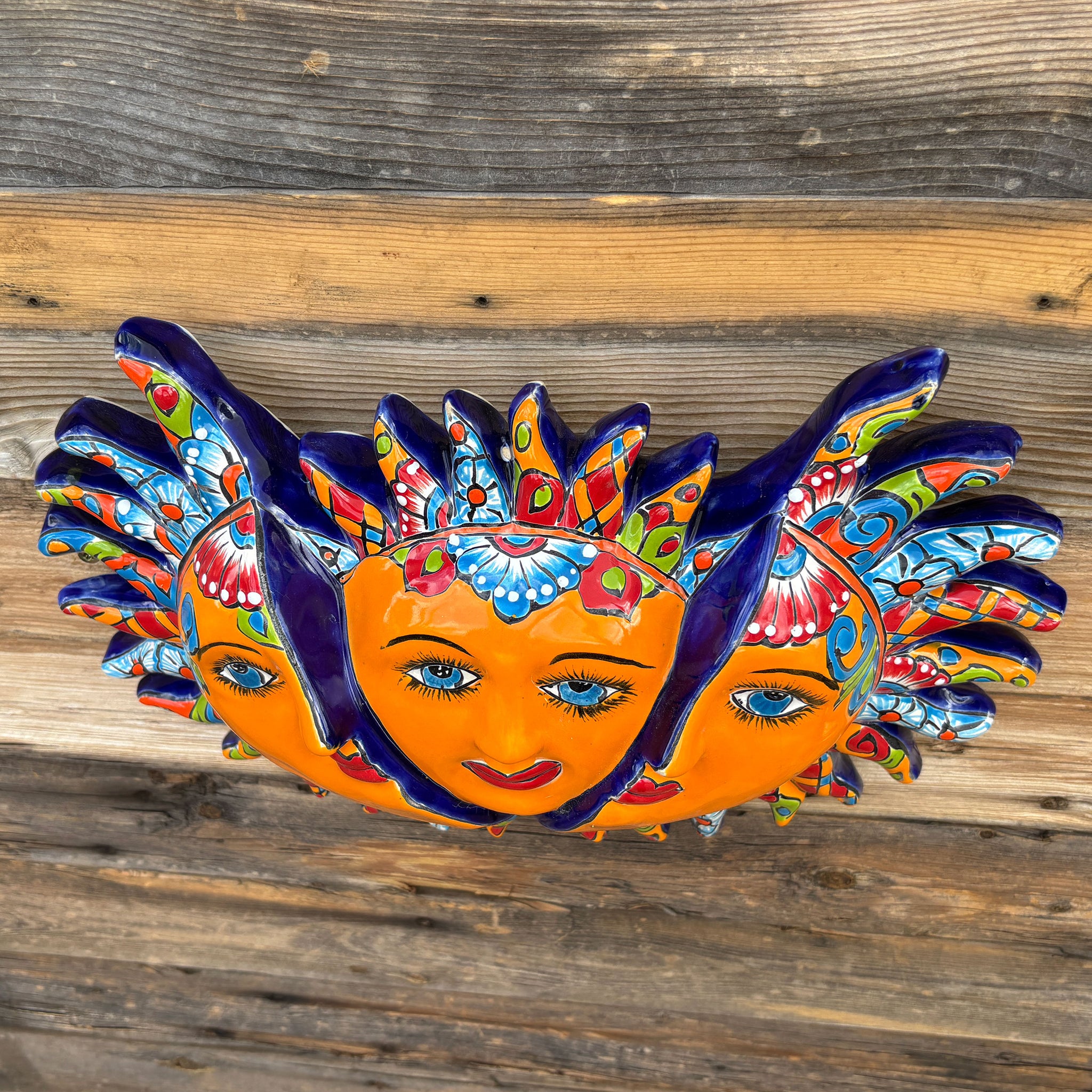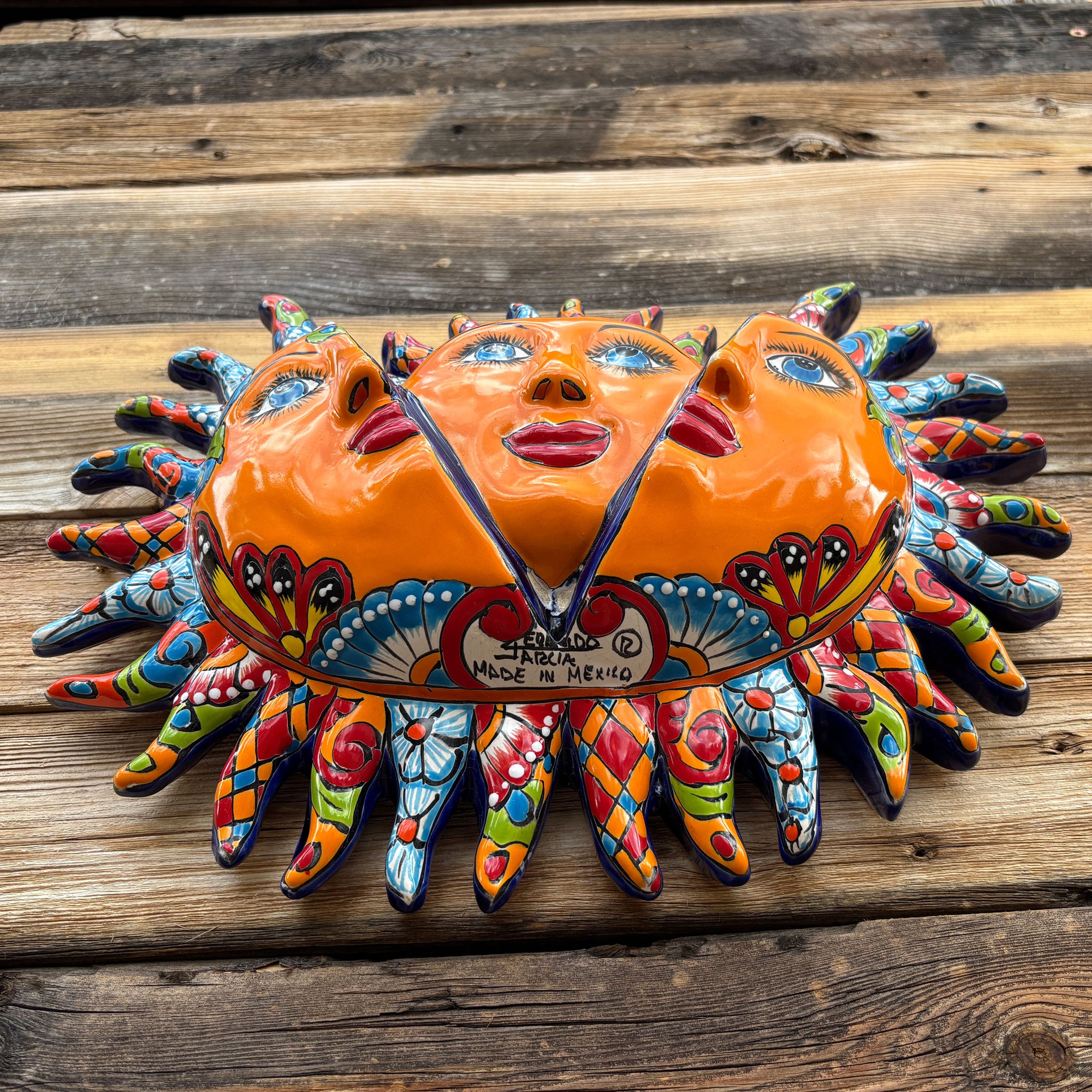 Señor Garcia demonstrates masterful technique in the creation of his Talavera ceramics. Each Sun is surrounded by intricately decorated flames radiating outward, totaling thirty individual hand-painted flames. These designs feature vibrant southwestern colors, typical of Mexican culture, which complement and balance the rich orange tones of the Sun’s face. The result is a lively and harmonious work of art, imbued with festive hues and a unique sense of energy.