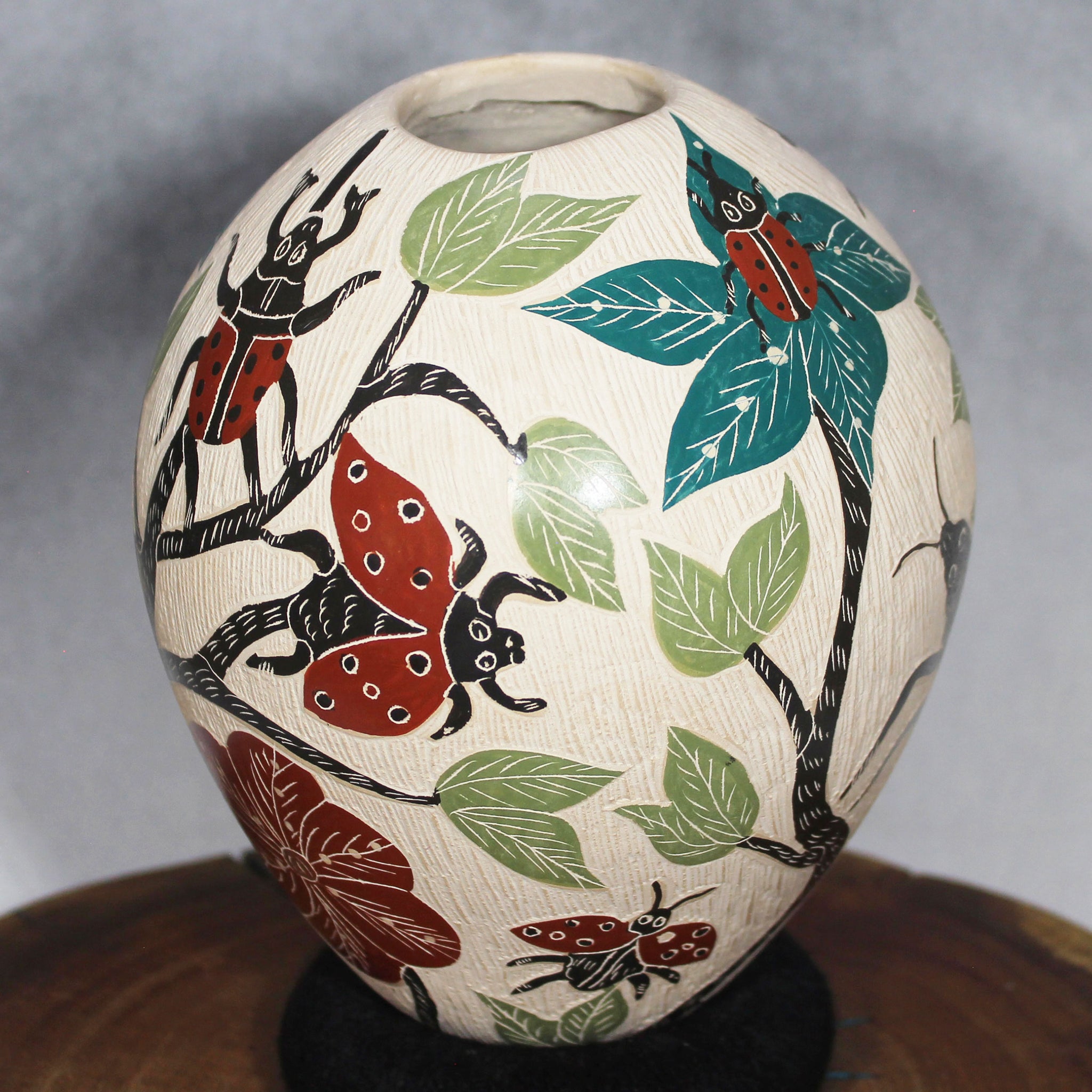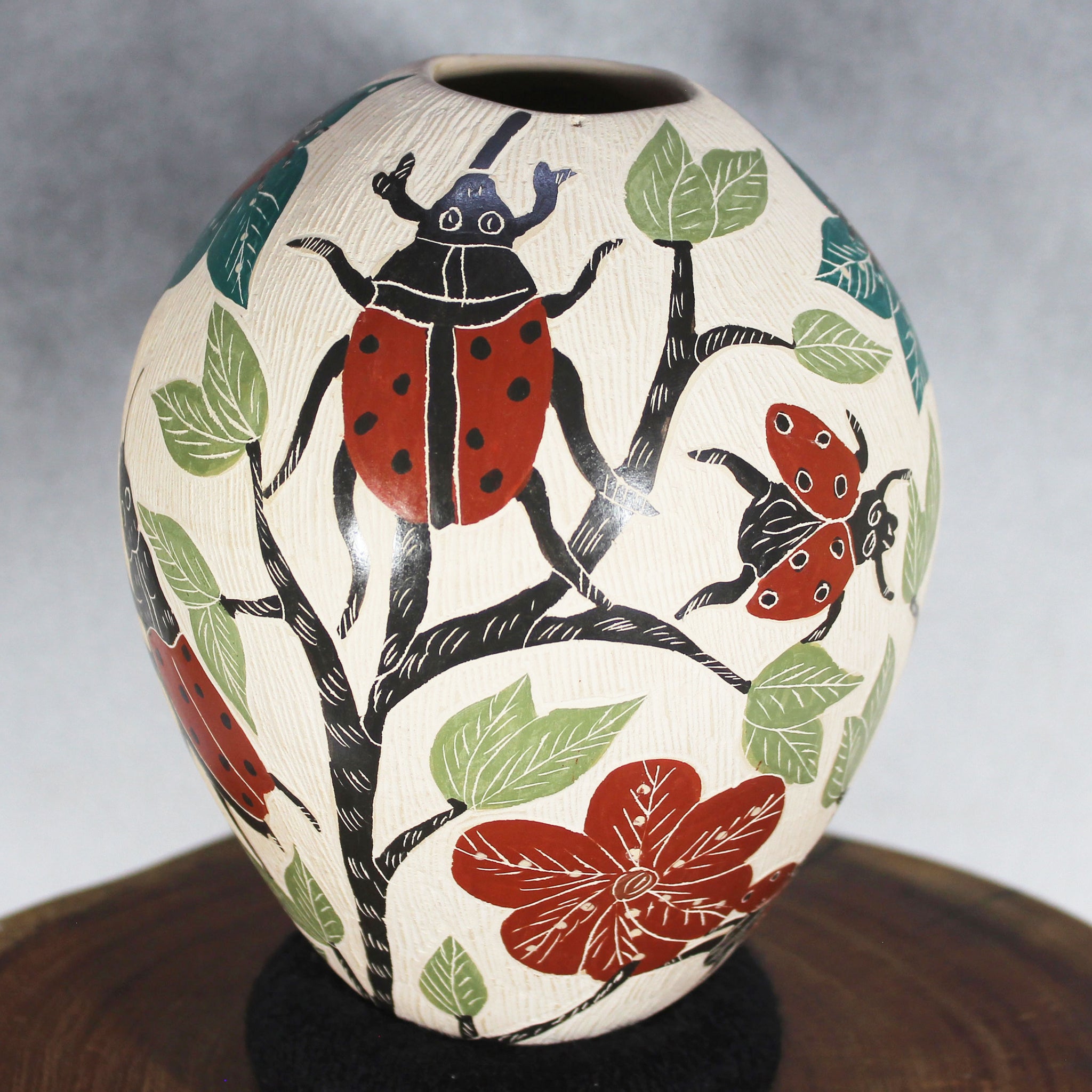 Each piece is carefully designed to incorporate intricate images. In this particular pottery, a 'loveliness' of ladybugs is featured. Yes, a group of ladybugs is called a 'loveliness'! These are skillfully etched through layers of brick red, romaine green and charcoal black glaze to reveal the underlying native white clay. There is even a early evening blue flower. This method creates visually compelling contrasts and depth in the artwork.