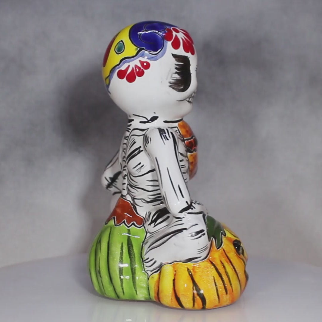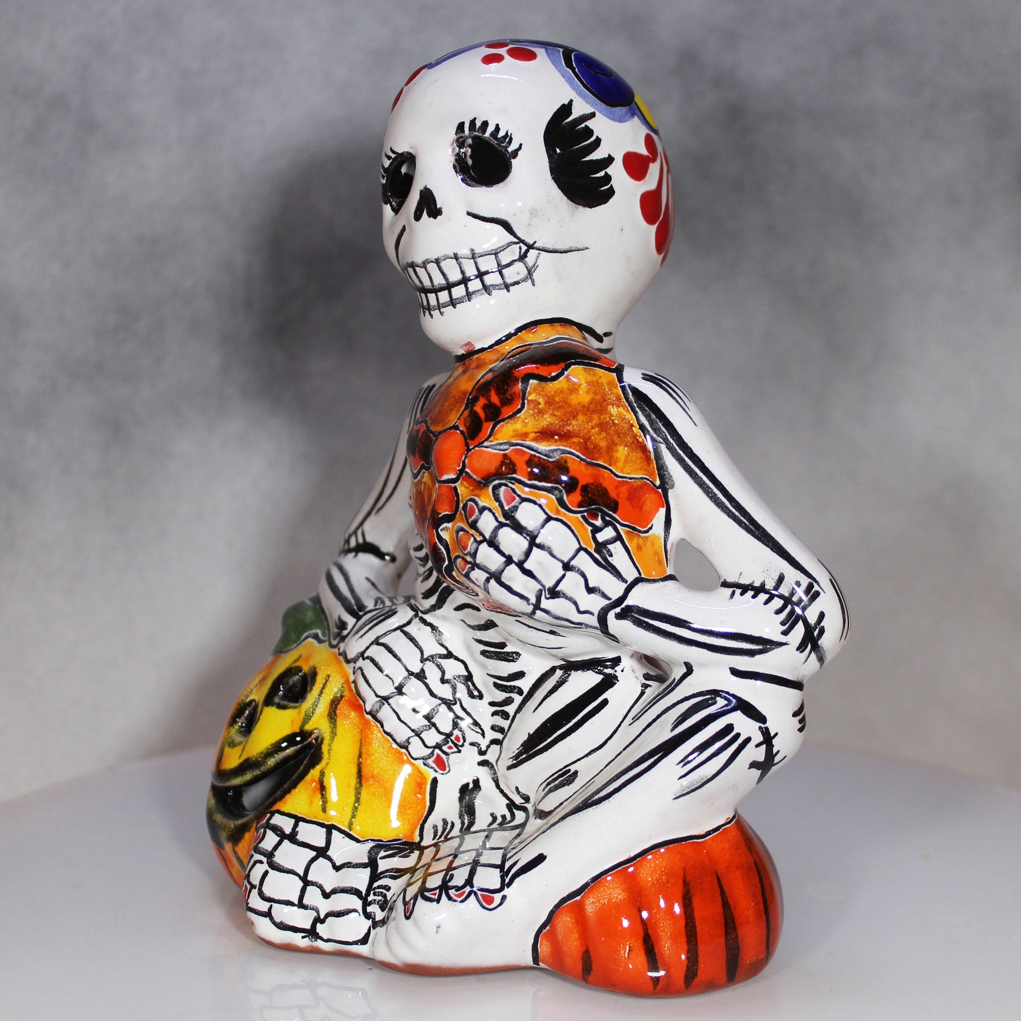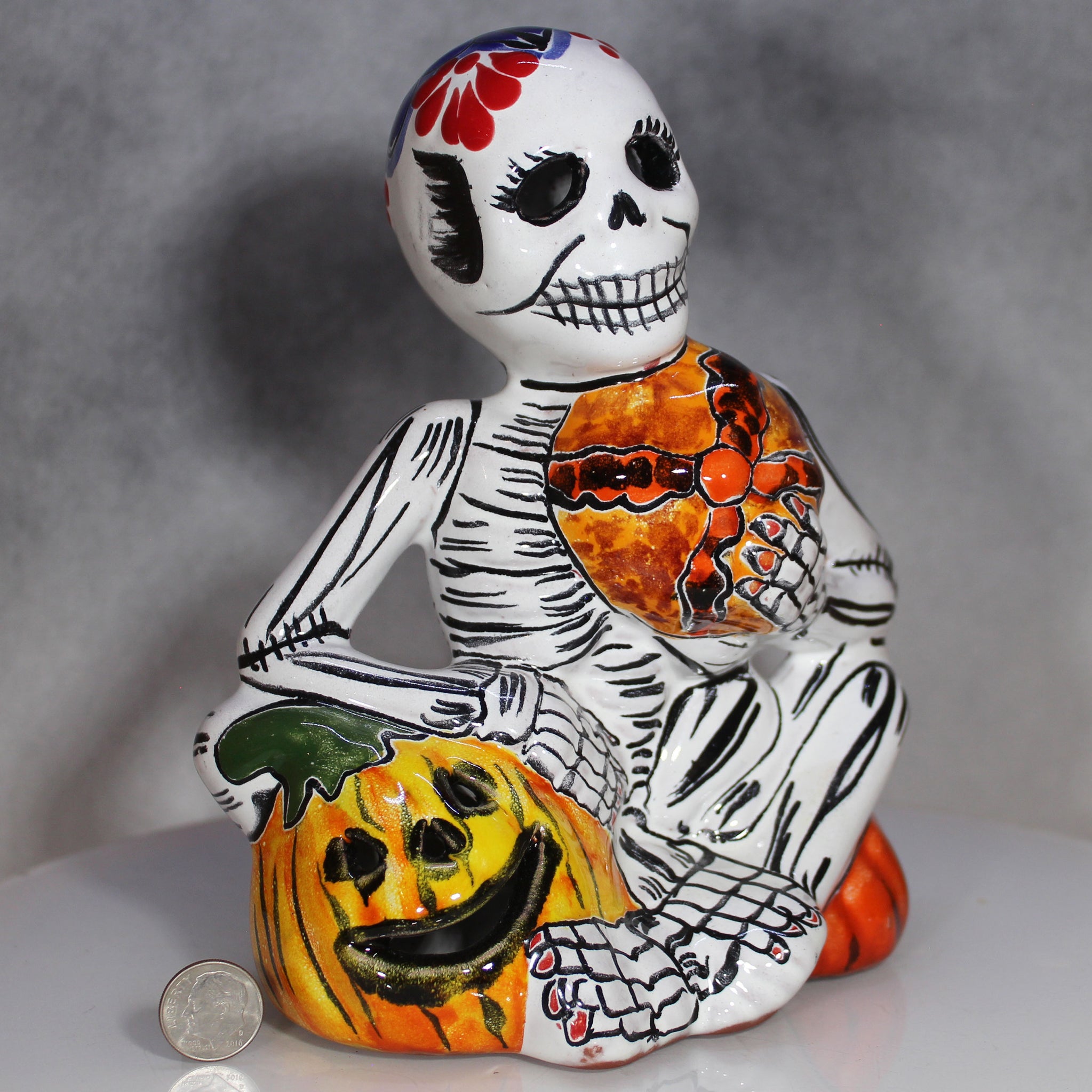 Here is a hand-painted, festively designed Talavera Mexican pottery of a Day of the Dead Skeleton surrounded by pumpkins.