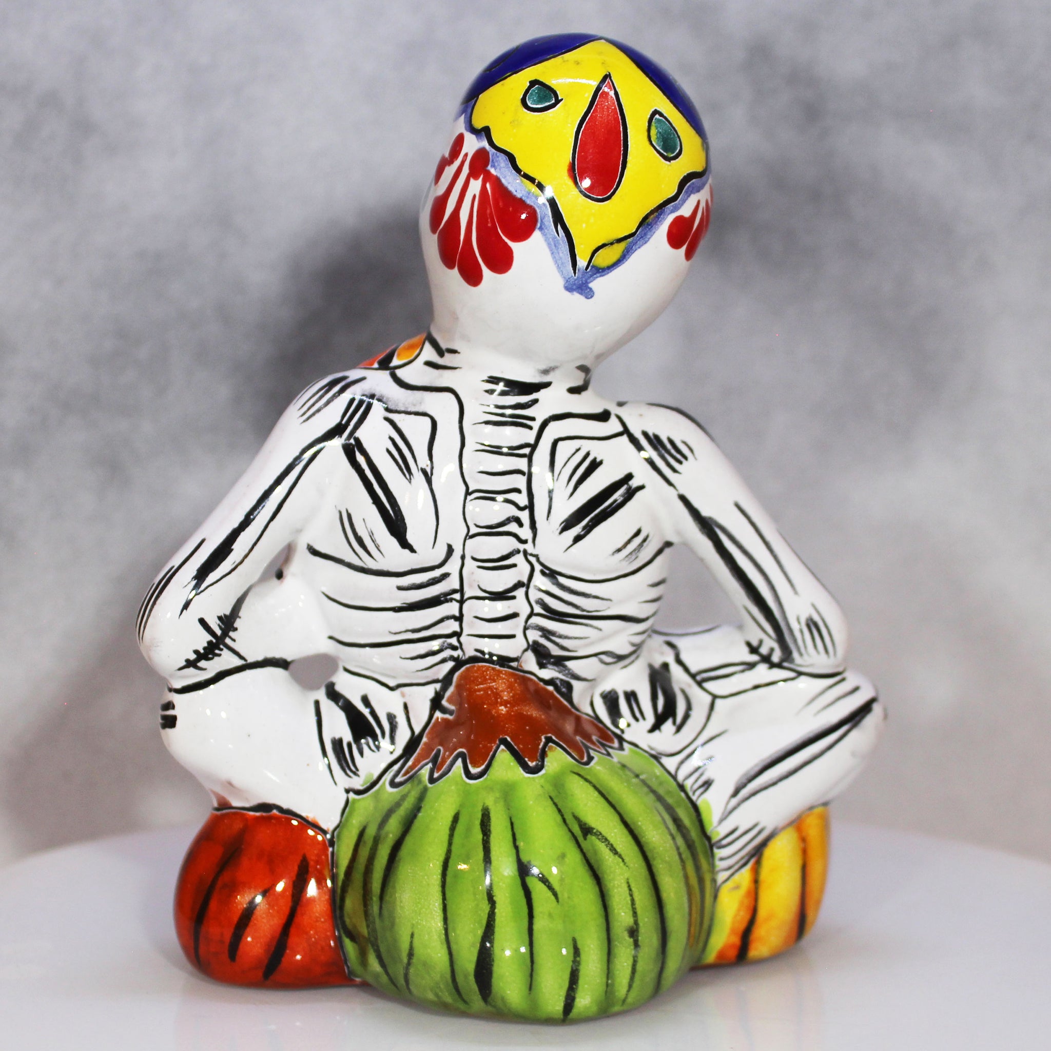 The figure is sitting amongst finely glazed pumpkins, and it has a wonderfully decorated skull. The eyes of the skeleton and the face of one of the pumpkins are open. Mini light slipped in through the bottom will give this figure a wonderful, moody glow. Figures like this skull are a common sight in southwest home gardens and patios, including my own. This Latin American Talavera artwork enhances the beauty and status wherever it is used.