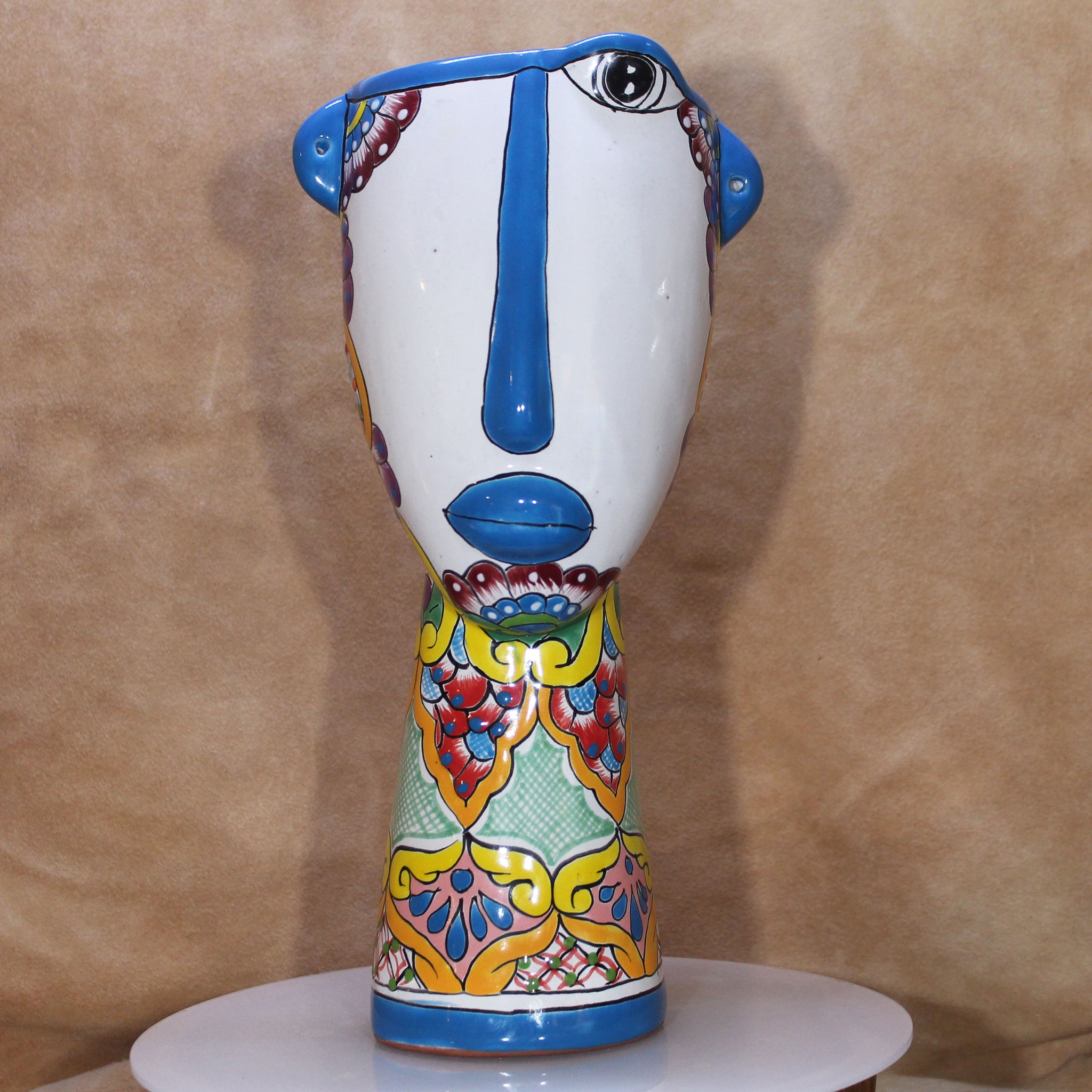 Señor Efren Beltran, an elusive, rare and talented artist from Dolores, Hidalgo, Mexico, is the artist of the surreal Face Talavera Mexican Pottery piece featured here. After years of searching, I am pleased to offer three of his remarkable works to the public for the first time. The acquisition of these pieces marks a significant milestone for my store, as his artistry has rarely been available outside of select circles.