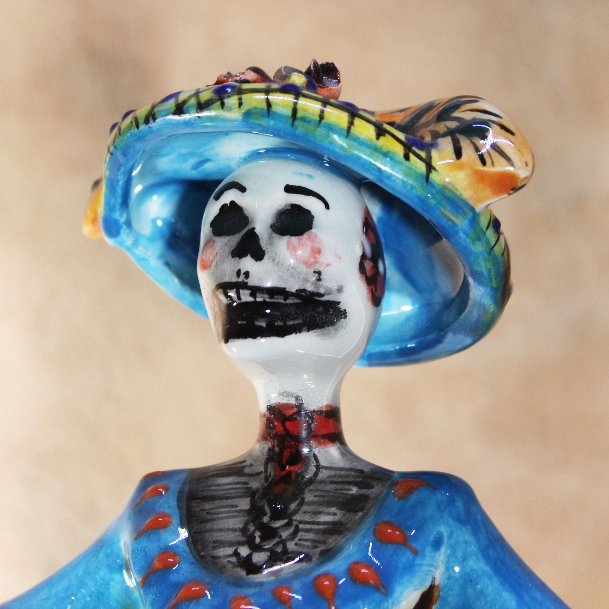 This splendid Talavera Catrina Bailarina Day of the Dead Figure, adorned with a distinctive hat, serves as a vibrant representation of Mexican culture and tradition. Known as the Catrina Bailarina, this figure traces its fascinating history back 125 years in Mexico. Her striking image was quickly embraced by the Dia De Muertos (Day of the Dead) national celebration, which is observed on November 1. This day is dedicated to honoring deceased loved ones, making the Catrina Bailarina an integral symbol of remembrance and festivity.