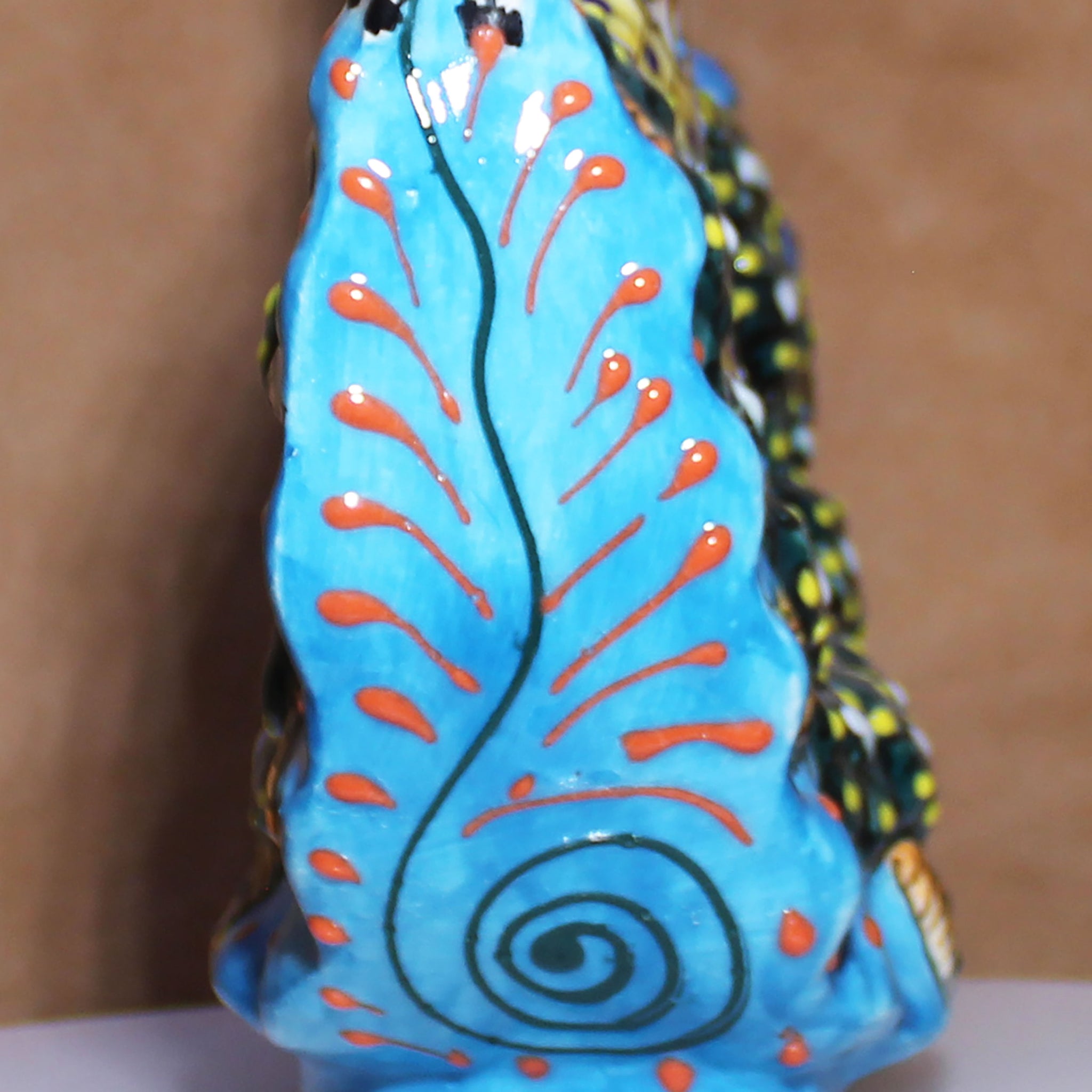 This specific Talavera Catrina figure stands out for her exquisite craftsmanship and attention to detail. The inclusion of the hat is unique, especially as it complements the dynamic pose of the woman, who appears to be spinning gracefully while holding up her dress. Each aspect of this figure is meticulously hand-painted, showcasing a cheerful Señora brought to life with a burst of festive colors.