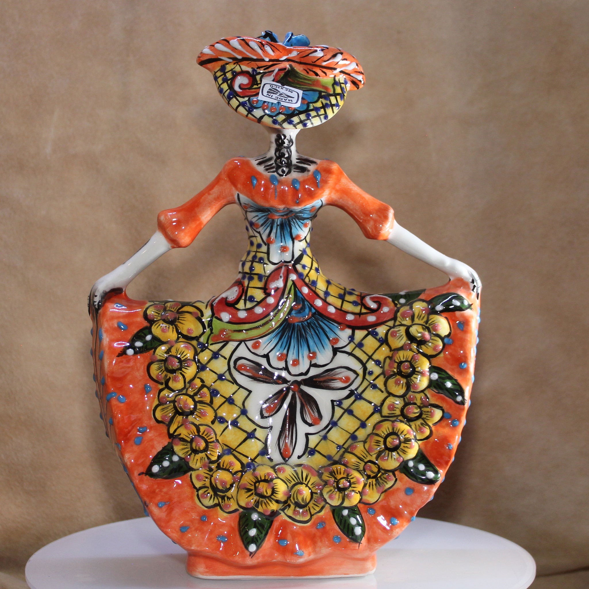 This specific Talavera Catrina figure stands out for her exquisite craftsmanship and attention to detail. The inclusion of the hat is unique, especially as it complements the dynamic pose of the woman, who appears to be spinning gracefully while holding up her dress. Each aspect of this figure is meticulously hand-painted, showcasing a cheerful Señora brought to life with a burst of festive colors.