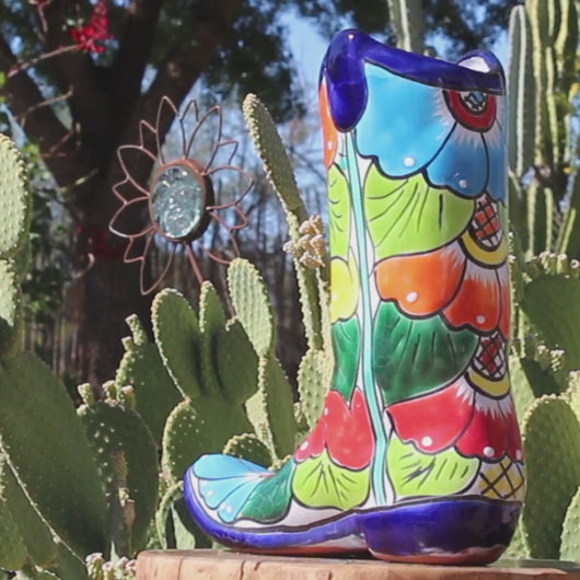 This Talavera Cowboy Boot Pottery exemplifies southwestern design, distinguished by its unique hand-painted features. This figurine is carefully hand glazed. Ideal for holding plants, this cowboy boot planter also serves as an attractive display piece in any setting.
