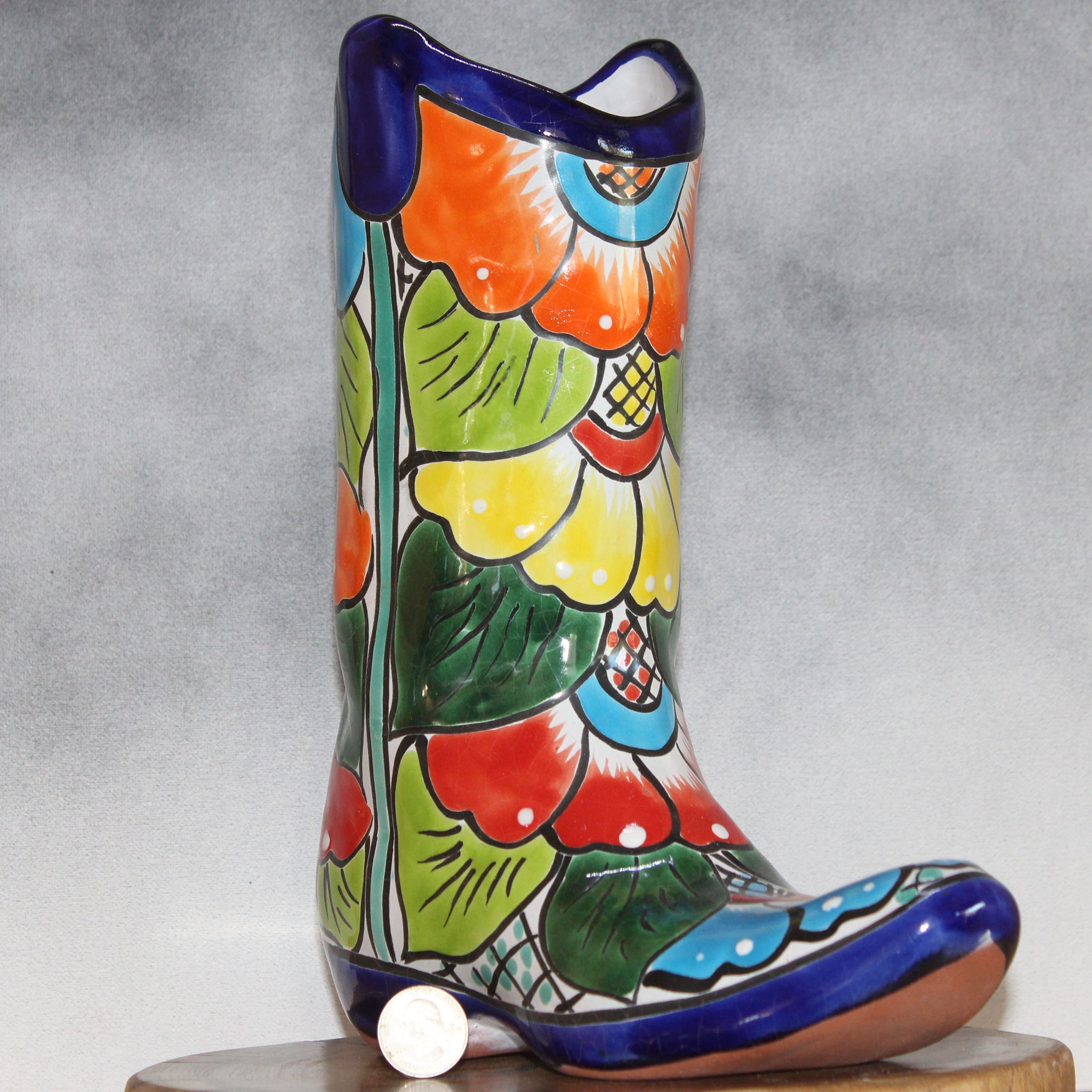 Be sure to explore the full selection of Talavera pieces available at my store! This piece is a festively glazed Talavera ceramic cowboy boot pottery and figure, exemplifying the finest in Mexican Latin ceramic folk art.