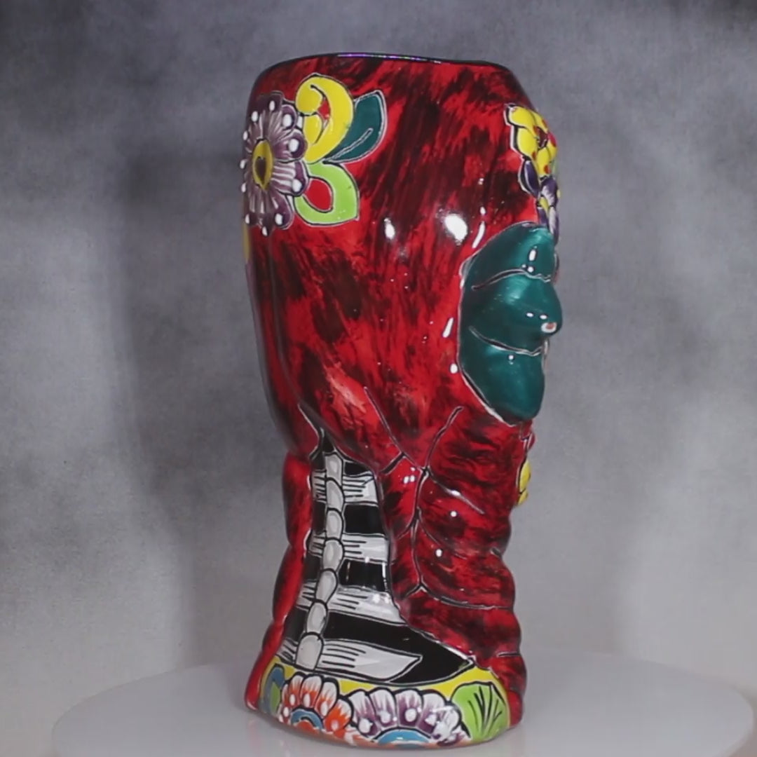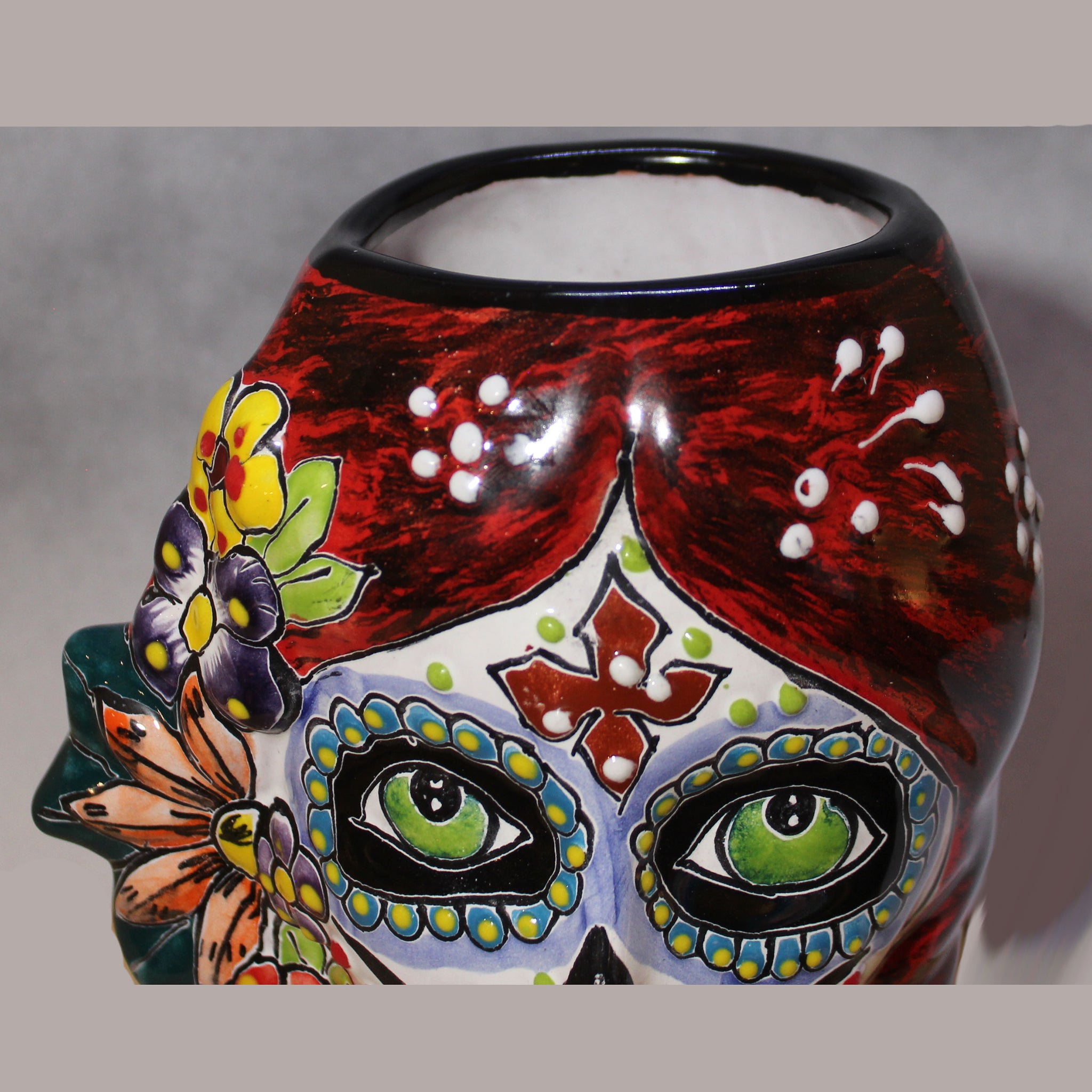 Here is a hand painted, uniquely designed Talavera Mexican Pottery of a Day of the Dead Green Eyed Maiden.